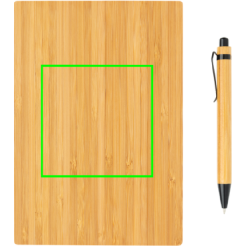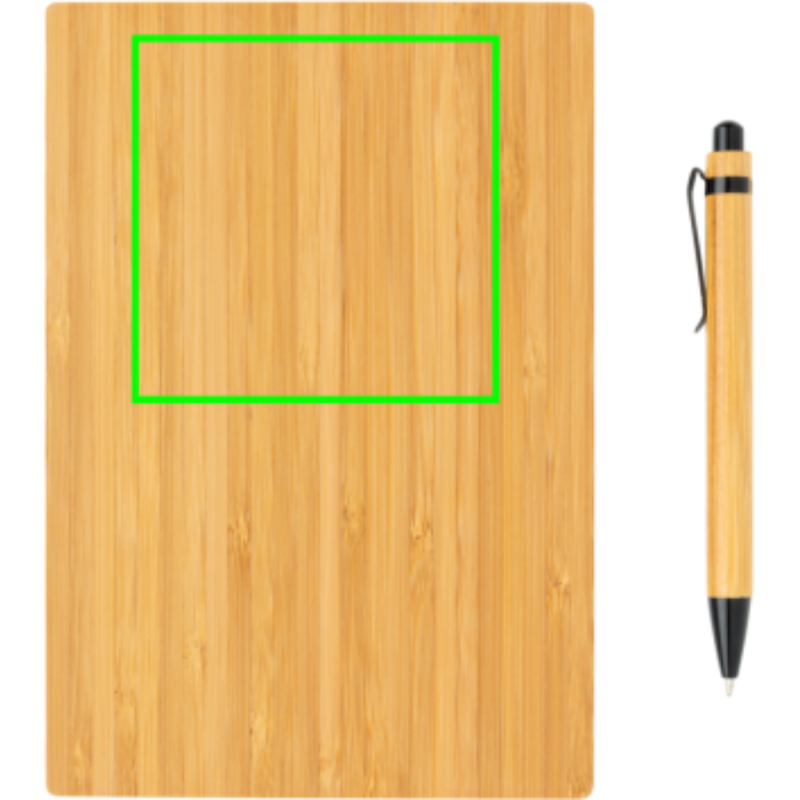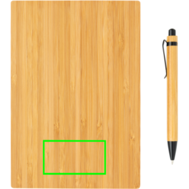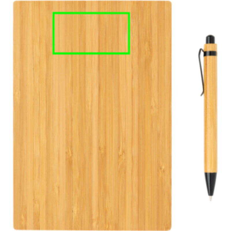 Ekologický set poznámkového bloku s perem. Poznámkový blok má bambusový obal a 90 listů/180 stran recyklovaného papíru o gramáží 70g/m2. Bambusové kuličkové pero s černým inkoustem. Baleno v kraftové dárkové krabičce.