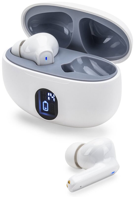 Nabíjecí pouzdro s digitálním displejem ukazuje stav baterie a díky kapacitě 200 mAh umožňuje až 3 plná nabití sluchátek.