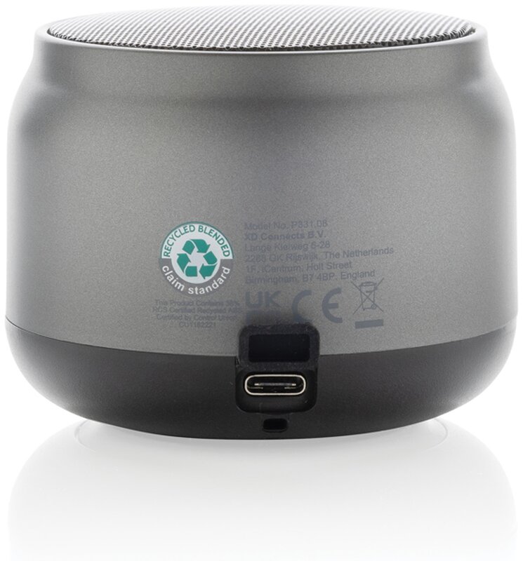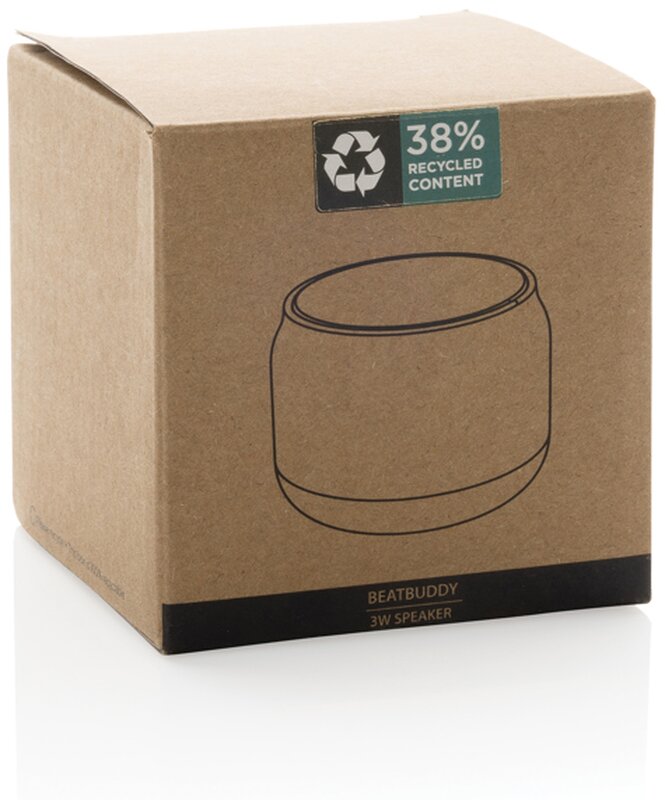 Bezdrátový 3W reproduktor je vyroben z recyklovaného ABS s certifikací RCS. RCS certifikace zajišťuje garanci použití recyklovaného materiálu díky transparentnímu přehledu nad dodavatelským řetězcem. Celkový podíl recyklátu dle váhy produktu: 22 %. Reproduktor je dodáván s 500 mAh baterií, která přináší až 4 hodiny přehrávání a lze ji dobít během 2 hodin. Součástí balení je nabíjecí kabel typu C vyrobený z recyklovaného TPE s certifikací RCS. Baleno v FSC® krabičce. Bez PVC.