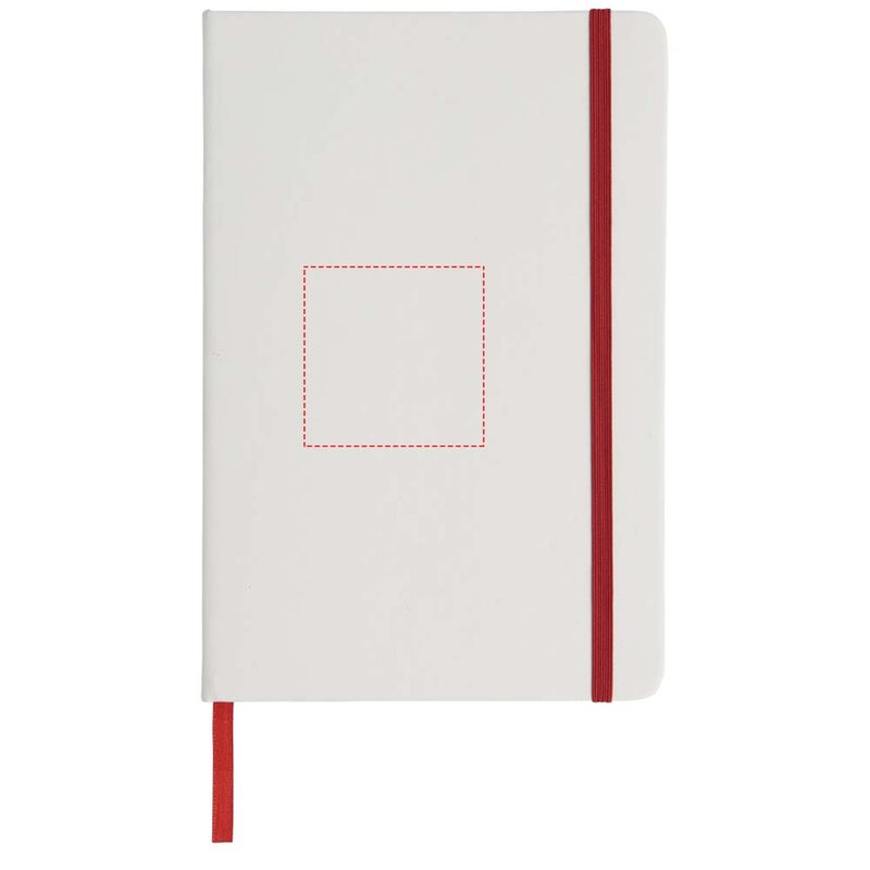 Bílý zápisník a barevnou gumičkou a stuhou uvnitř má 96 linkovaných listů pro vaše poznámky. Zápisník je vhodný pro aplikaci vašeho loga nebo jiného motivu i v plnobarevném provedení.