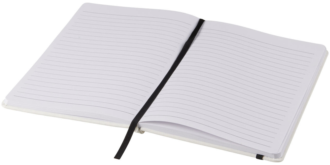 Bílý zápisník a barevnou gumičkou a stuhou uvnitř má 96 linkovaných listů pro vaše poznámky. Zápisník je vhodný pro aplikaci vašeho loga nebo jiného motivu i v plnobarevném provedení.