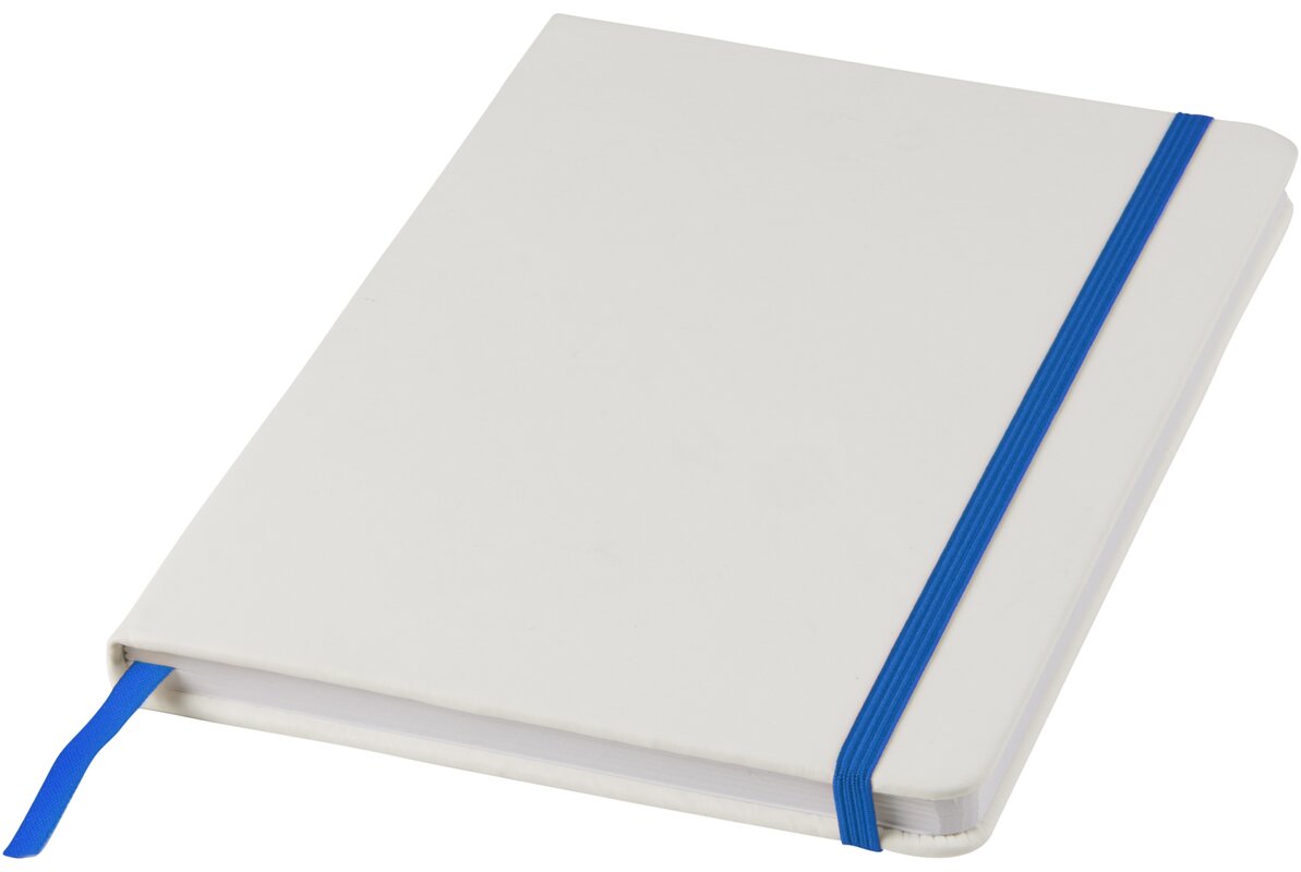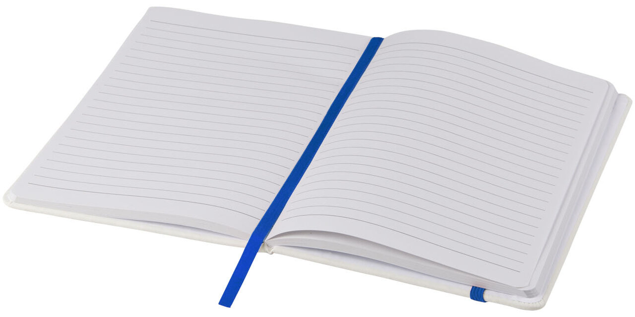 Bílý zápisník a barevnou gumičkou a stuhou uvnitř má 96 linkovaných listů pro vaše poznámky. Zápisník je vhodný pro aplikaci vašeho loga nebo jiného motivu i v plnobarevném provedení.
