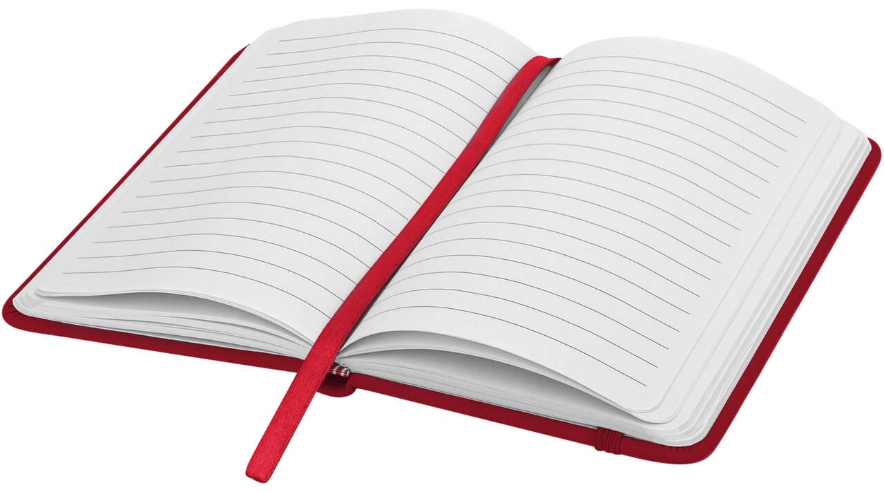Zápisník velikosti A6 nabízí 96 linkovaných listů pro vaše poznámky. Zápisník má také barevnou gumičku pro uzavírání a stuhu. Povrch desek je vhodný pro potisk vašeho loga nebo jiného motivu.