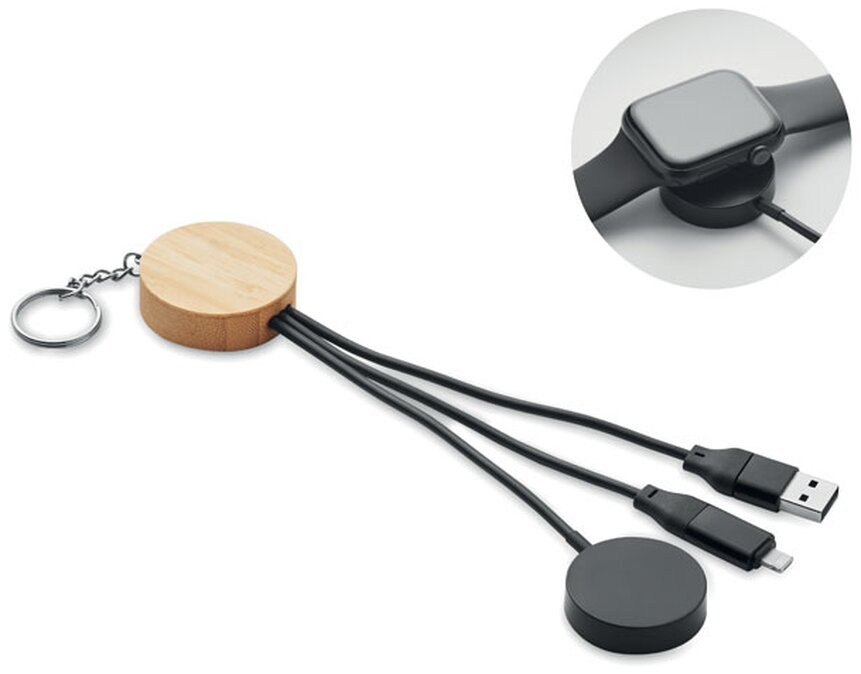 Klíčenka a nabíjecí 60W kabel 4v1. S bambusovým detailem. Vstup: 2v1 Type-C a Type-A. Výstup: Nabíjení hodinek (Samsung® a Apple®), Type-C a micro-B (2v1 kolíku).