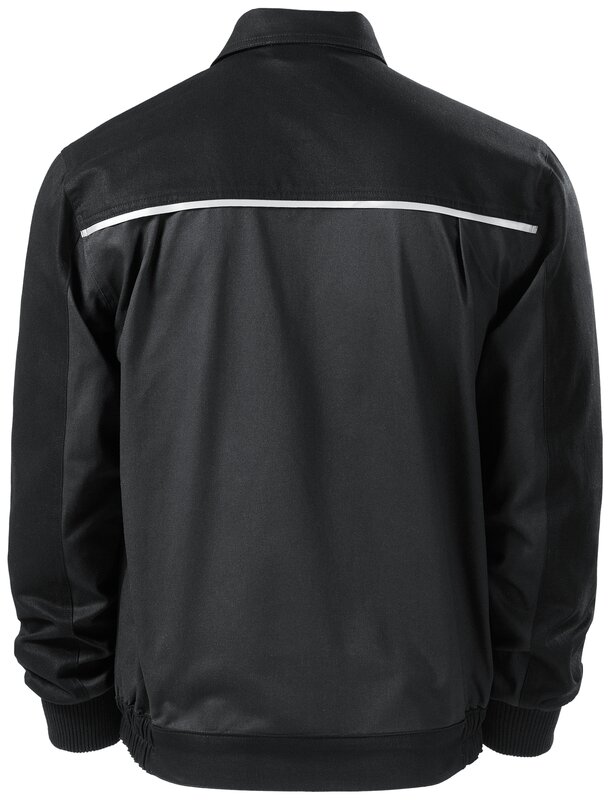 Pánská pracovní bunda s retroreflexní páskou na zádech a rukávech. Rukávy zakončené elastickou manžetou (97 % bavlna, 3 % elastan). Multifunkční kapsy. Pruženka v boční části dolního kraje bundy. Poutko na zavěšení. Zadní díl se záhyby pro volnost pohybu.