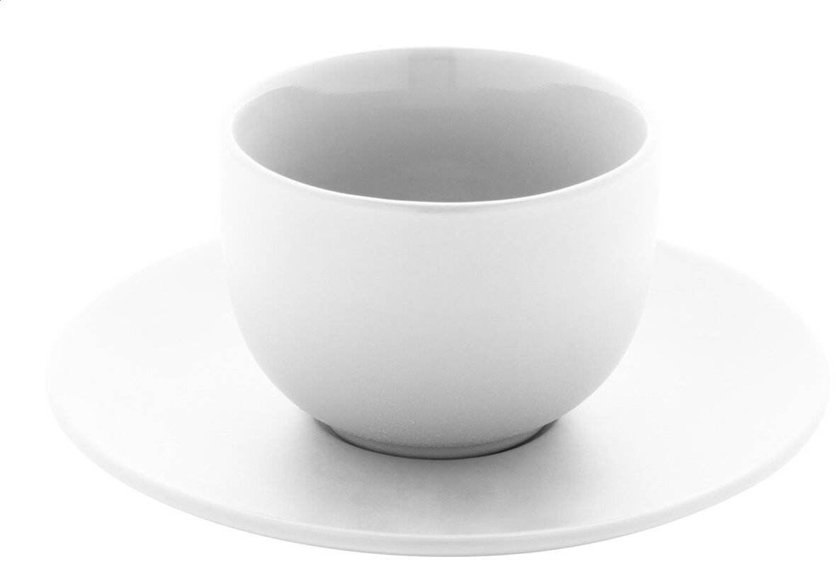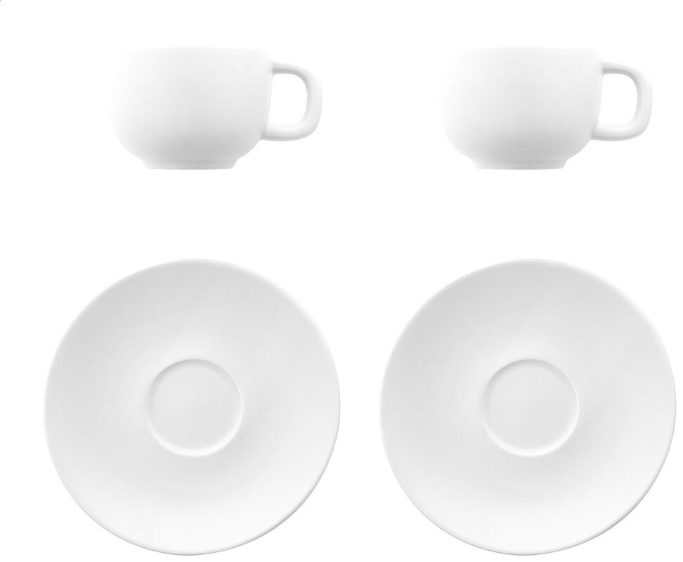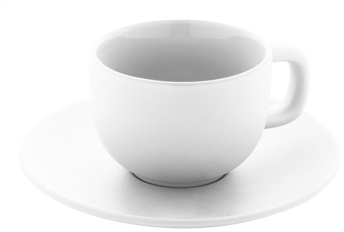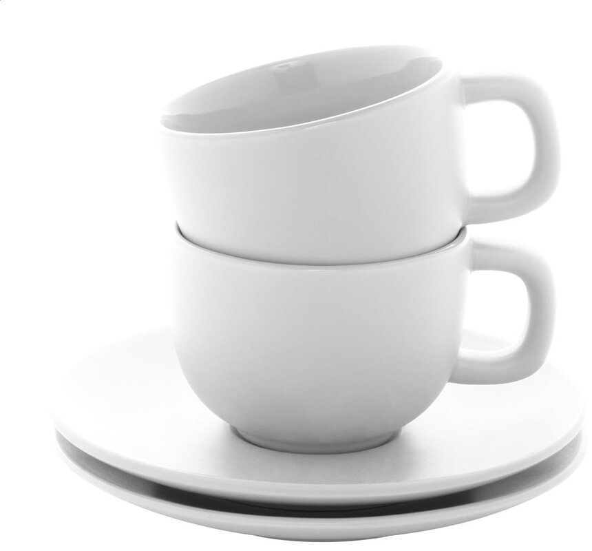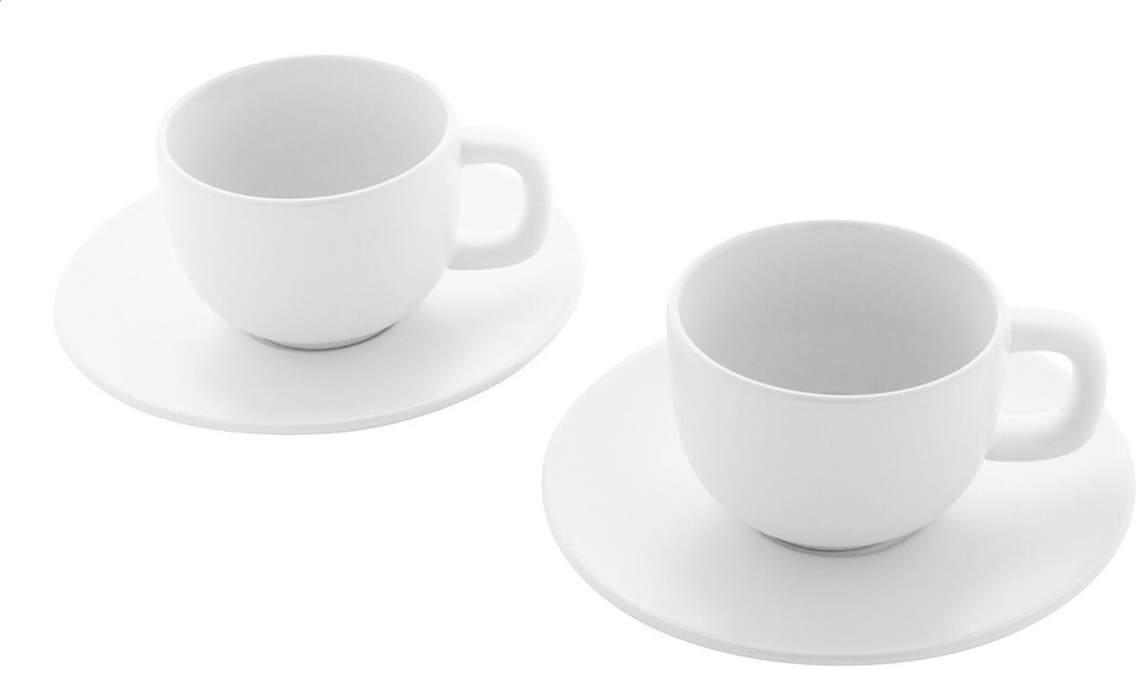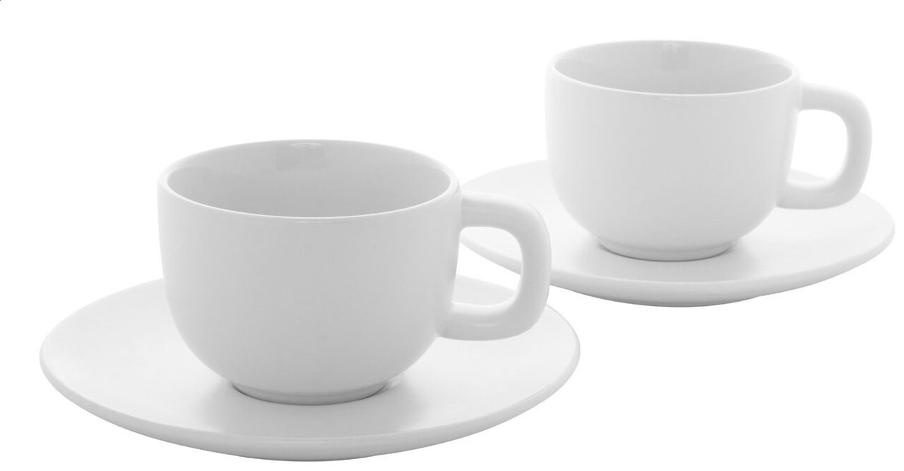 Vysoce kvalitní keramická sada šálků na cappuccino se 2 šálky a podšálky. S matnou vnější a lesklou vnitřní povrchovou úpravou. 200 ml. V kraftové papírové krabici.2 šálky a 2 podšálky – kompletní sada pro servírování espressa