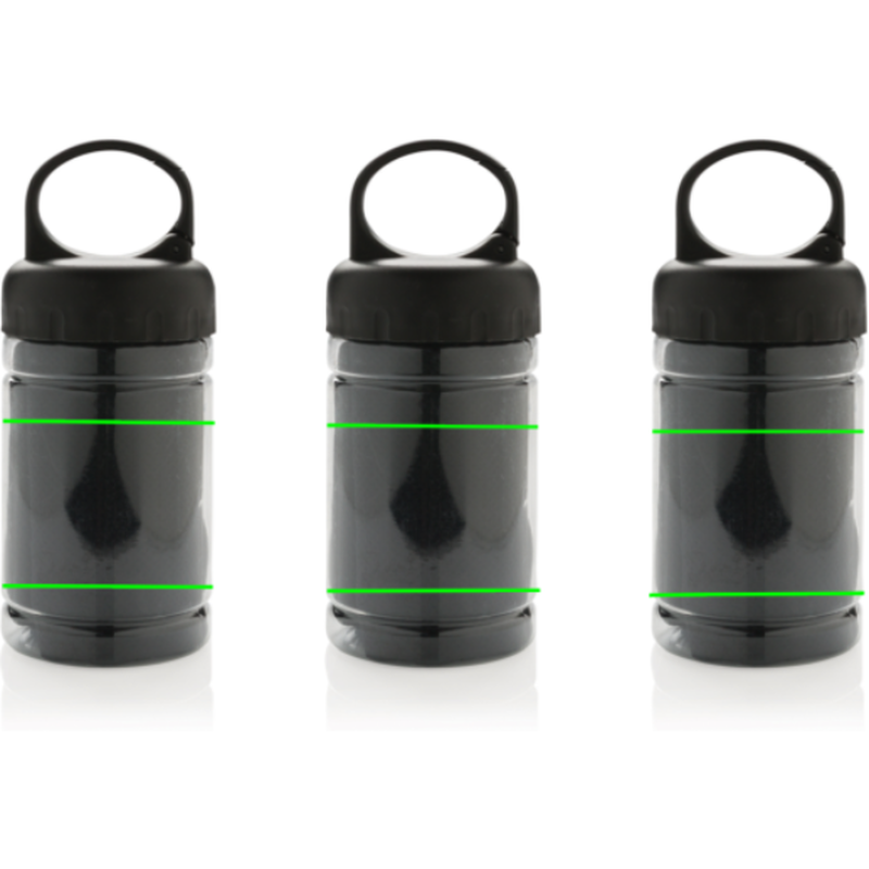Ručník z mikrovlákna je skvělý k osvěžení při sportu. Jednoduše přidejte studenou vodu do láhve, čímž se ručník ochladí a při použití je nádherně osvěžující. Láhev je vyrobena z PP s víčkem z ABS s karabinou pro upnutí. Funkce blokování až 98 % slunečního záření s UV50+ ochranou. Velikost ručníku: 77 x 30cm.