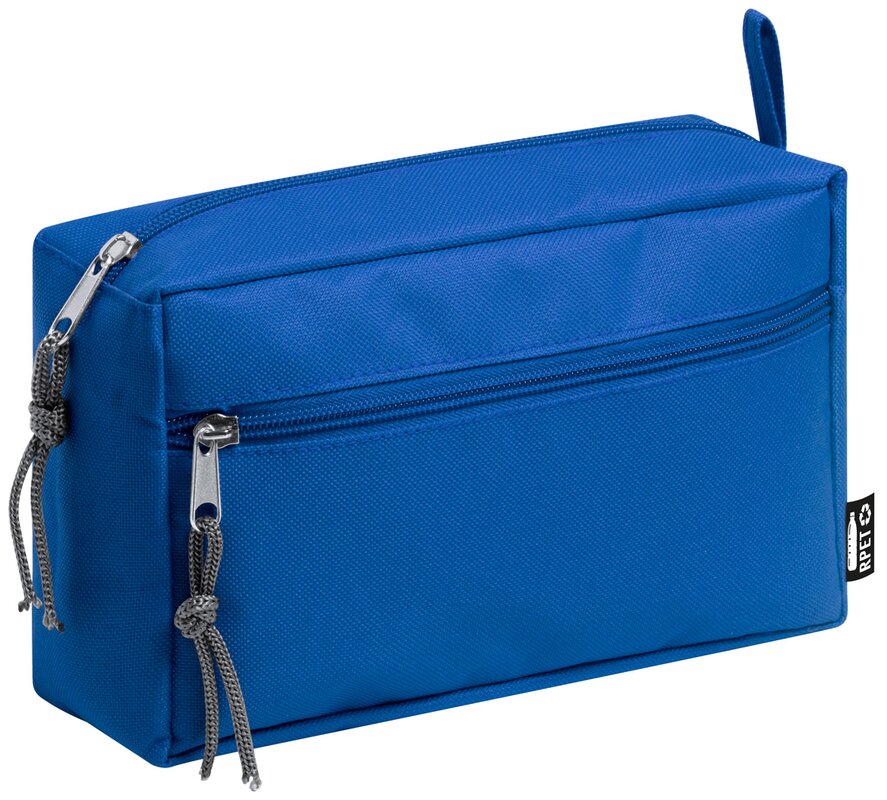 Kosmetická taštička z 600D RPET polyesteru se 2 přihrádkami na zip, s etiketou s označením RPET.