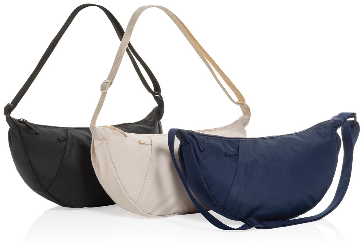 Větší crossbody taška Crescent XL ve tvaru půlměsíce z recyklovaného polyesteru AWARE™, ideální pro firemní potisk. AWARE™ technologie zaručuje skutečné použití recyklovaných materiálů. Pohodlný tvar půlměsíce dobře sedí na těle a snadno se nosí celý den. Větší kapacita pojme vše potřebné pro každodenní použití, vnější kapsa na zip umožní rychlý přístup k drobnostem. Nastavitelný ramenní popruh se přizpůsobí každému.
