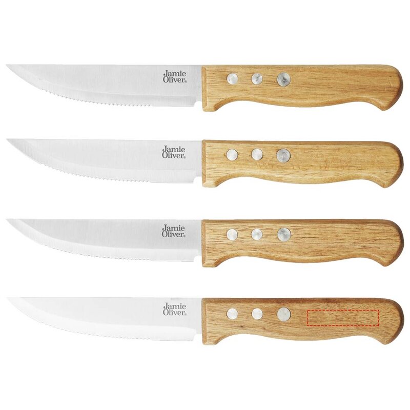 Čtyřdílná sada steakových nožů Jumbo. Pusťte se s chutí do svého oblíbeného pečeného masa těmito pořádnými steakovými noži. Dodáváno v dárkové kazetě Jamie Oliver. Exkluzivní design. Nerezová ocel a dřevo.
