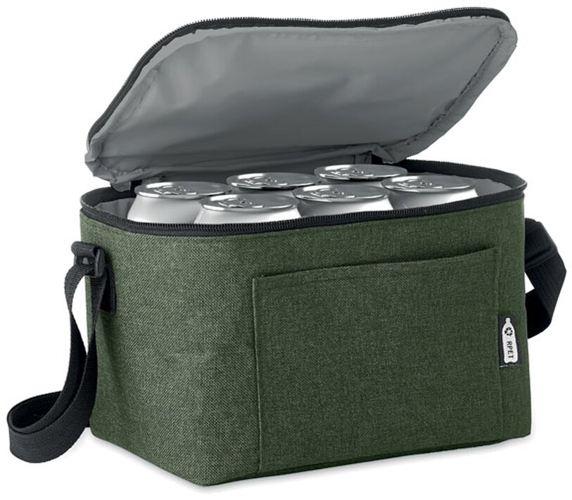 Chladicí taška na 6 plechovek vyrobená z 600D RPETu s přední kapsou. V teplých letních dnech si vezměte tuto chladicí tašku s sebou na pláž nebo do parku, abyste uchovali až 6 plechovek piva nebo limonády v chladu. K uložení menších věcí použijte přední kapsu. S ramenním popruhem můžete tašku snáze přenášet. Vnější strana je vyrobena z recyklovaného PET materiálu a vnitřní strana je izolovaná, aby Vaše nápoje zůstaly chladné. Celková kapacita je 3 litry. Izolační materiál: 0,15 PEVA + 3 mm pěna.