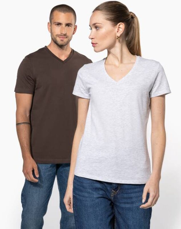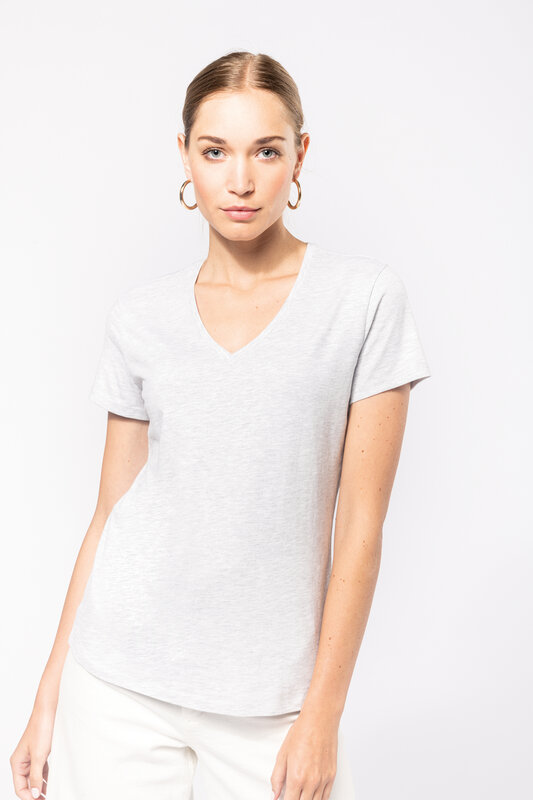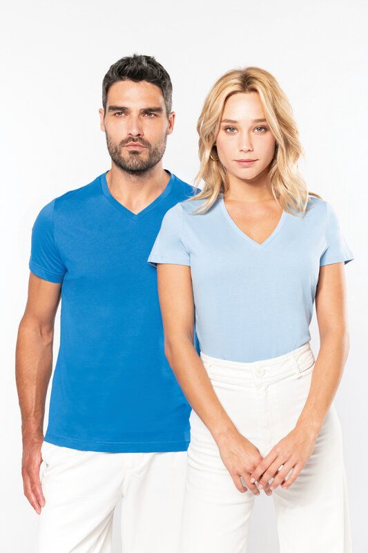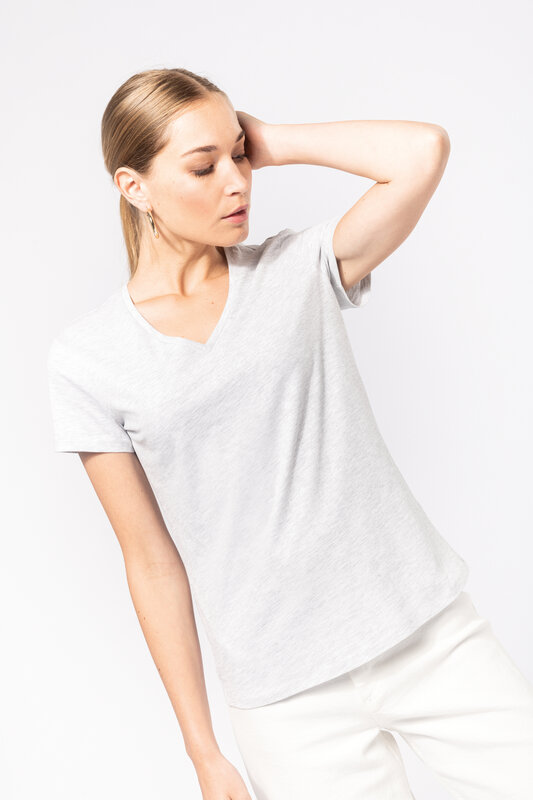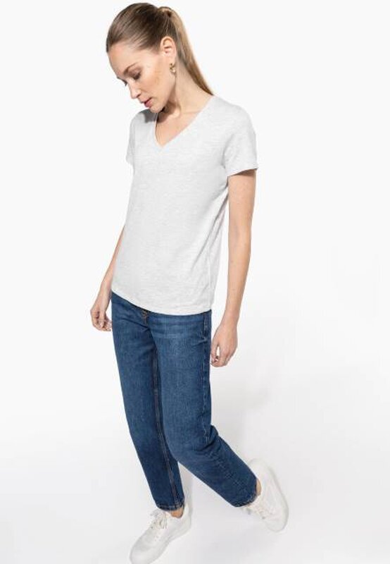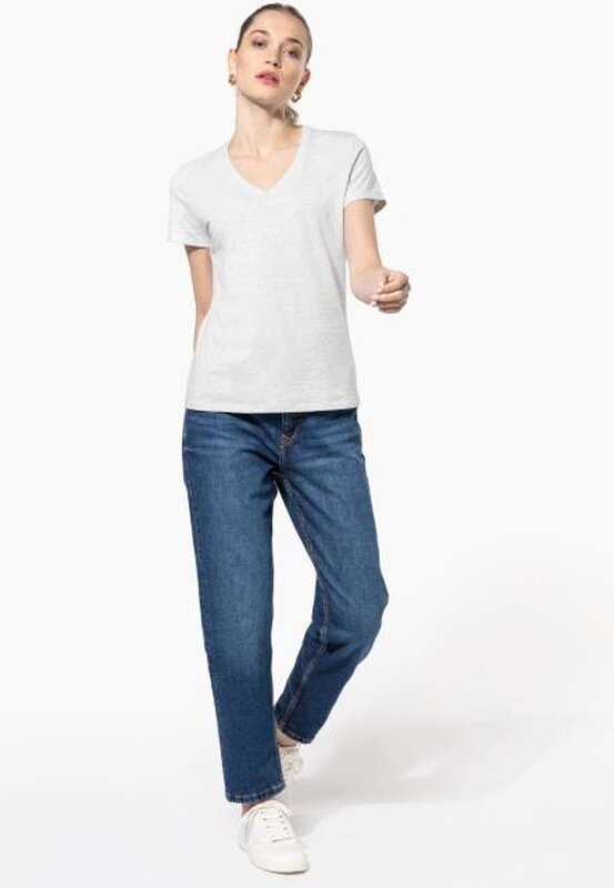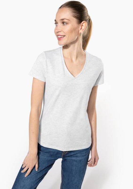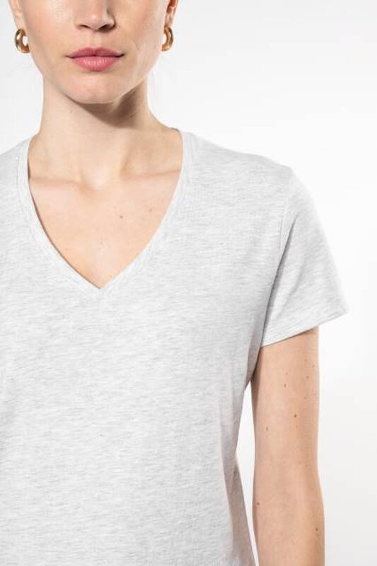 Vypasované dámské triko s úzkým hlubokým výstřihem do V. Triko má zpevňující kontrastní lemovku za krkem a dvojité švy. Triko je ze 100% bavlny, 180 g/m2 a je možné ho prát na 40 ° i sušit v sušičce, ale při nízké teplotě. Chemické čištění není doporučeno.