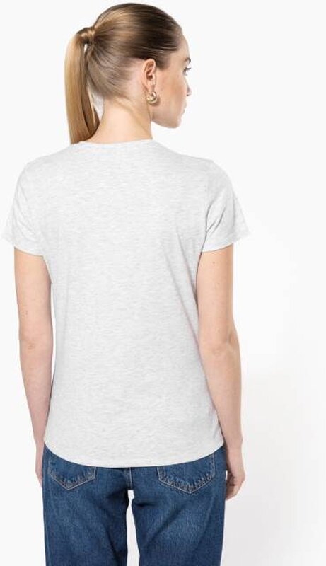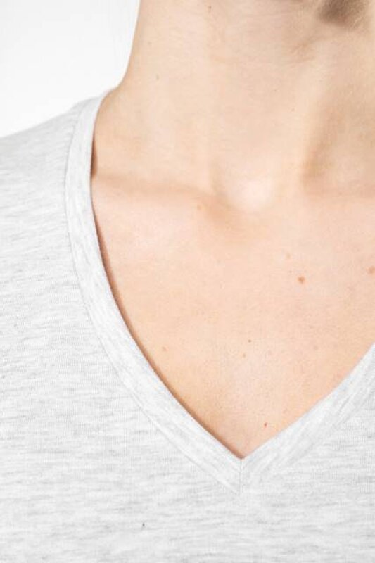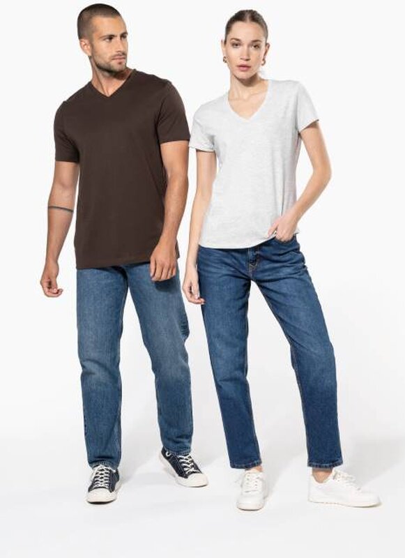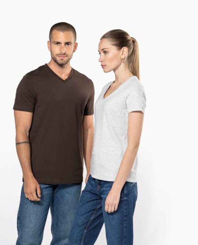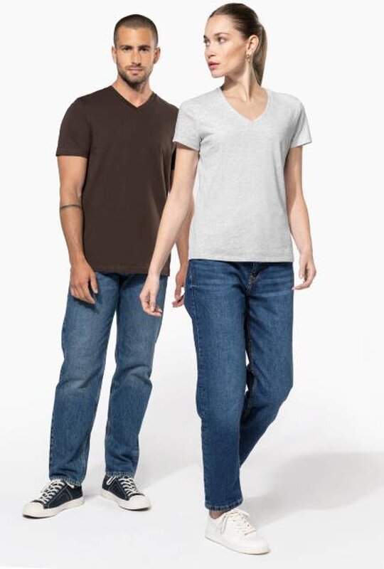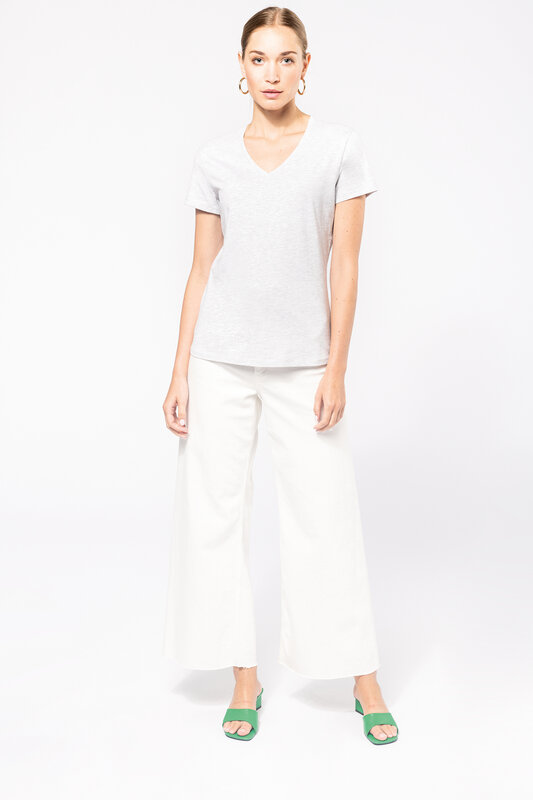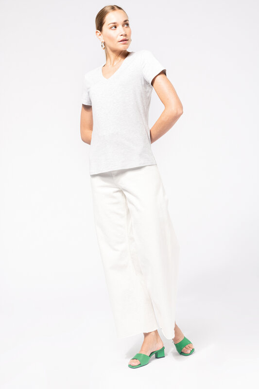 Vypasované dámské triko s úzkým hlubokým výstřihem do V. Triko má zpevňující kontrastní lemovku za krkem a dvojité švy. Triko je ze 100% bavlny, 180 g/m2 a je možné ho prát na 40 ° i sušit v sušičce, ale při nízké teplotě. Chemické čištění není doporučeno.