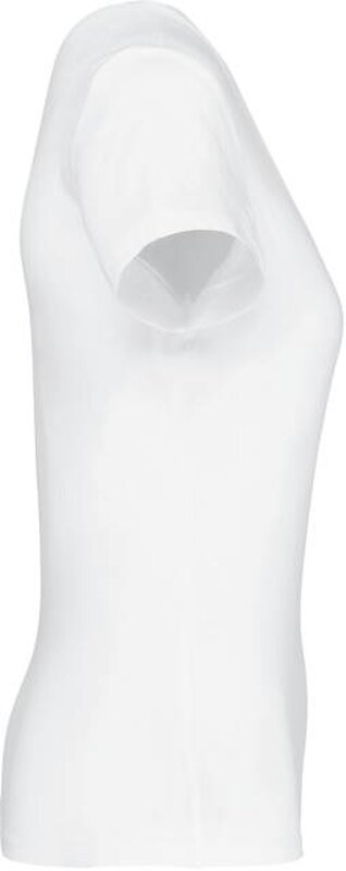 Vypasované dámské triko s úzkým hlubokým výstřihem do V. Triko má zpevňující kontrastní lemovku za krkem a dvojité švy. Triko je ze 100% bavlny, 180 g/m2 a je možné ho prát na 40 ° i sušit v sušičce, ale při nízké teplotě. Chemické čištění není doporučeno.