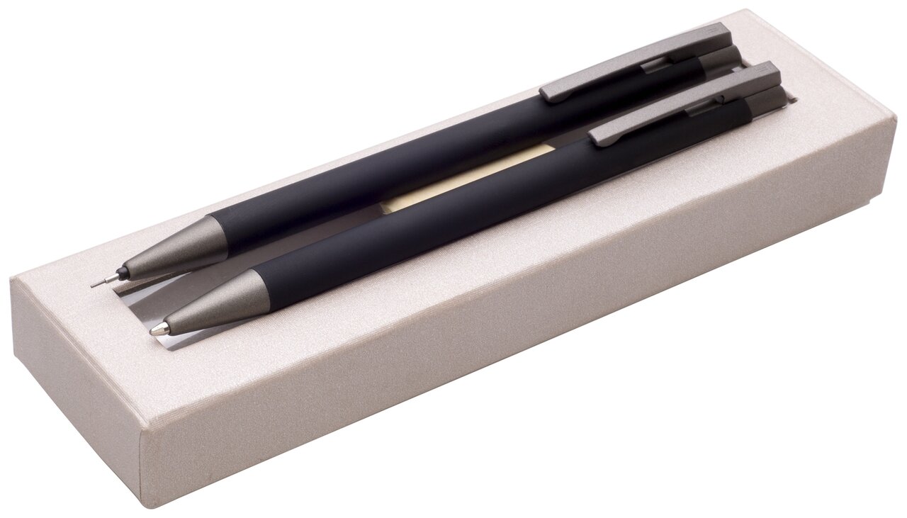 Dárková sada propisky a mikrotužky s pogumovaným povrchem a šedými doplňky v luxusním dárkovém pouzdru s průhledným okénkem.