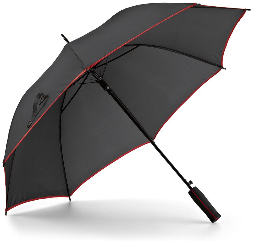 Deštník klasického tvaru s automatickým otvíráním v černé barvě doplněné o kontrastní barevný pruh na okrajích a držadle.