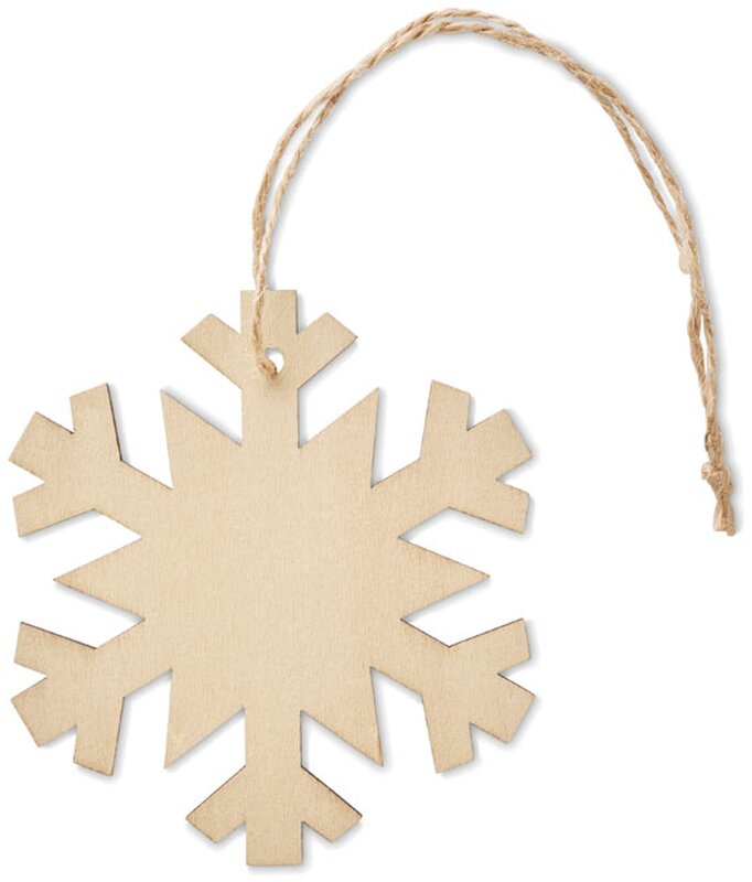 Dřevěná ozdoba ve tvaru vločky z MDF s jutovou šňůrou. MDF je přírodní materiál a proto se barevnost a tvar jednotlivých ozdob může mírně lišit.