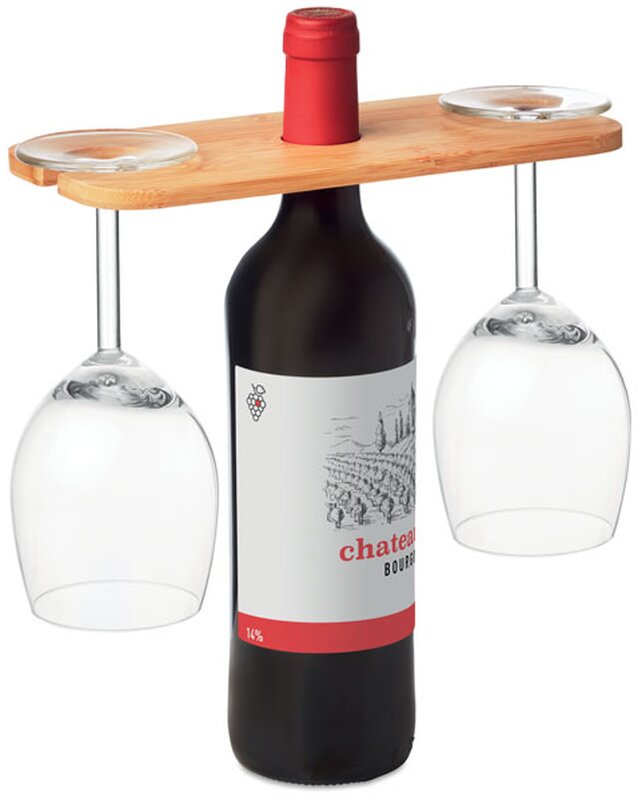 Držák na 2 sklenice a víno, který je vyrobený z bambusu. Bambus je přírodní materiál, barva předmětů se může mírně lišit.