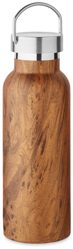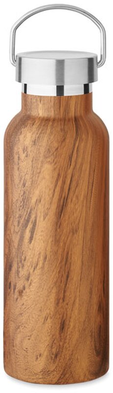 Dvoustěnná izolační vakuová láhev z recyklované nerezové oceli (90 % recyklované nerezové oceli a 10 % nerezové oceli) s dřevěným vzhledem a víčkem s uchem na přenášení. Objem: 500 ml.