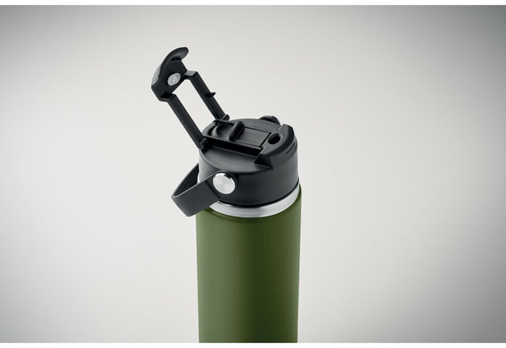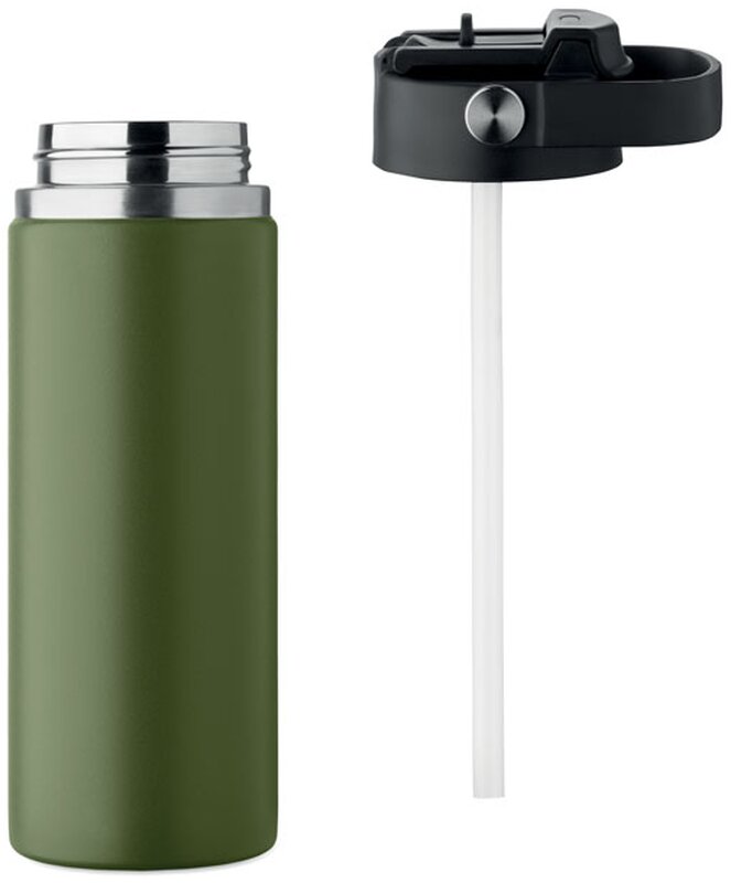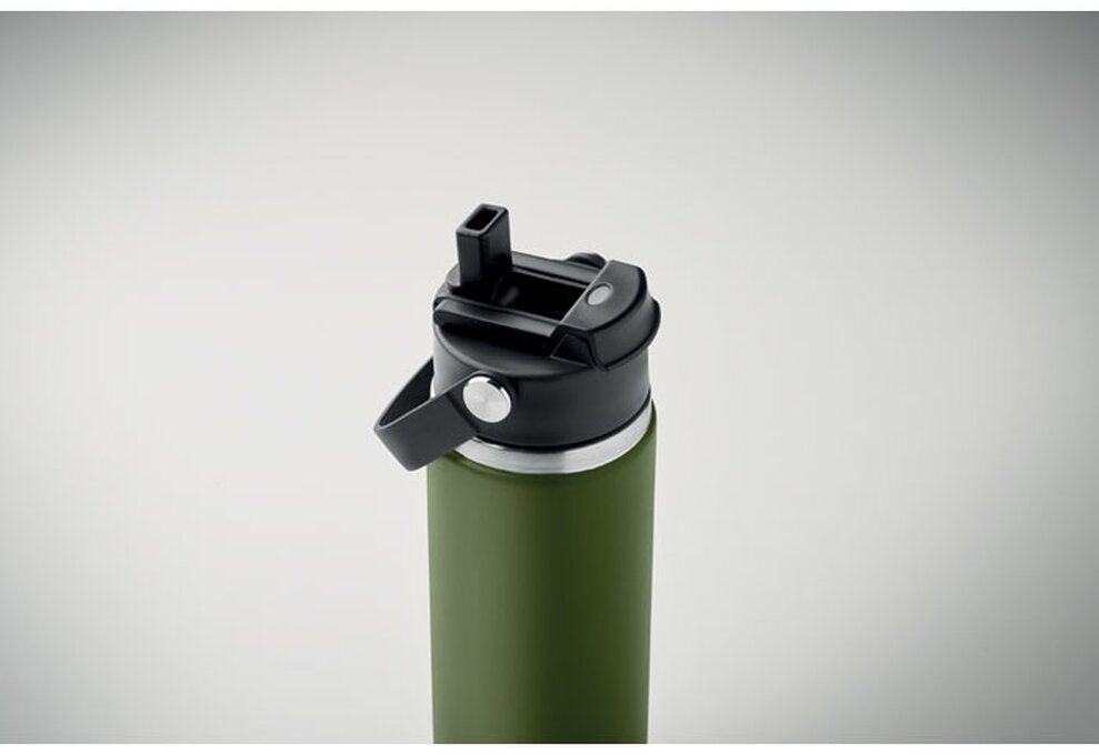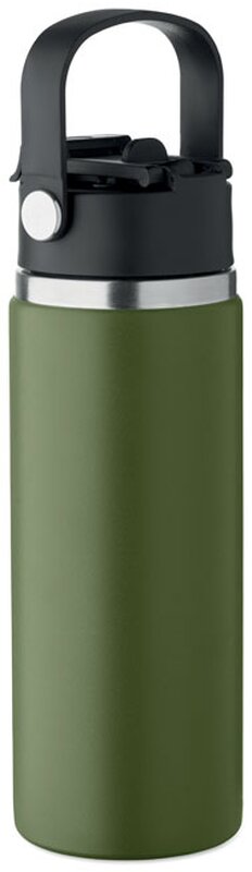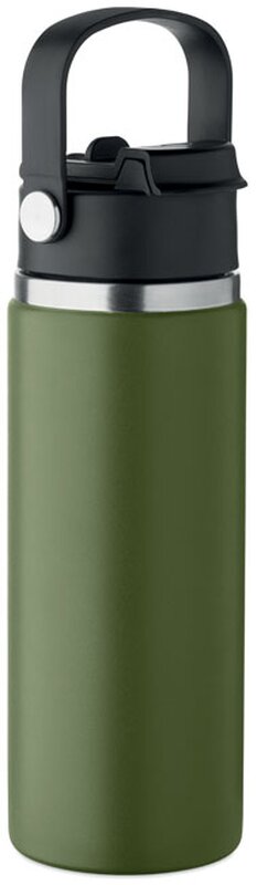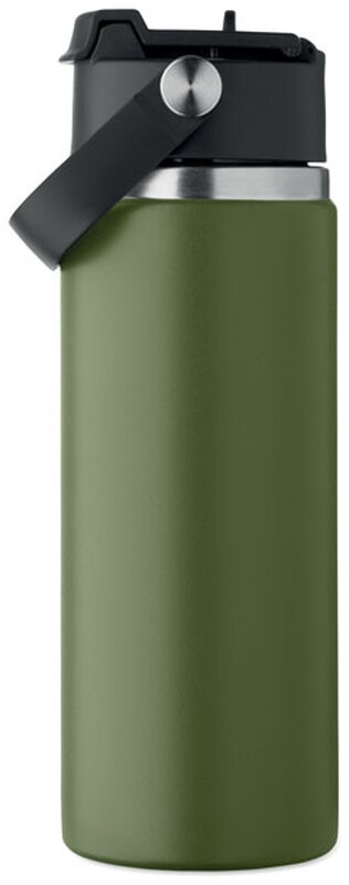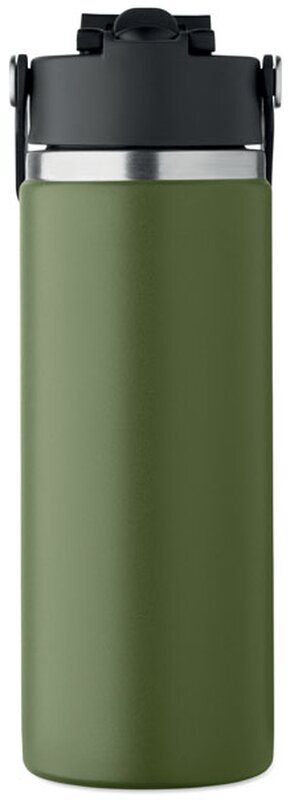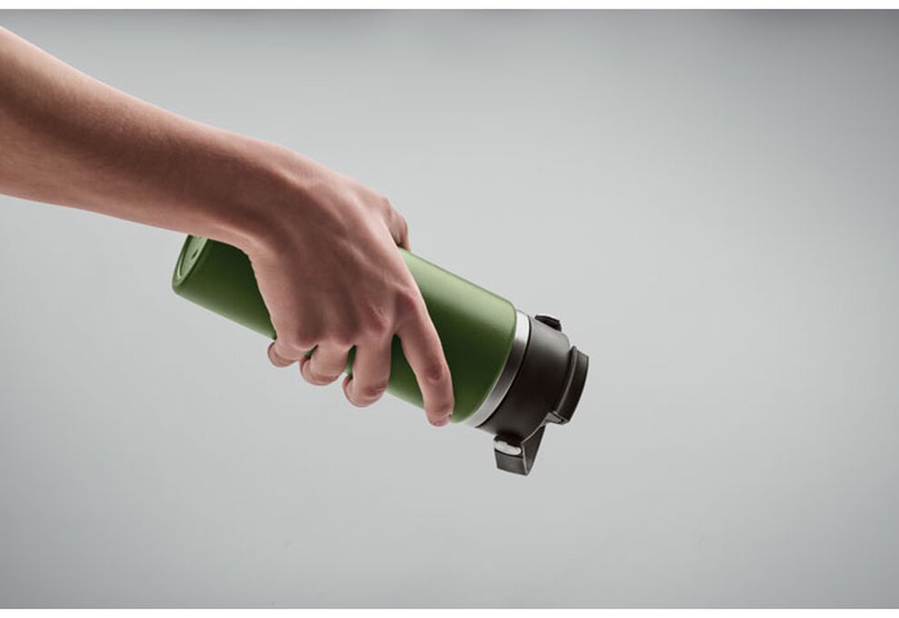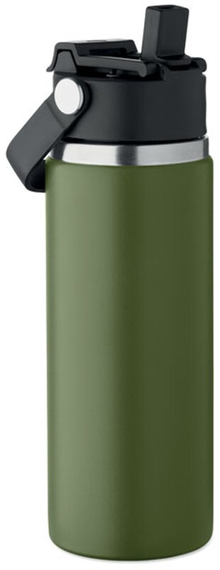 Dvoustěnná termoláhev z recyklované nerezové oceli (90 % recyklované nerezové oceli a 10 % nerezové oceli) s kombinovaným víčkem, brčkem a rukojetí. Neteče. Objem: 500 ml.