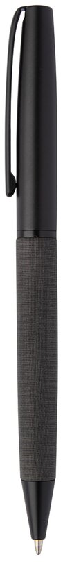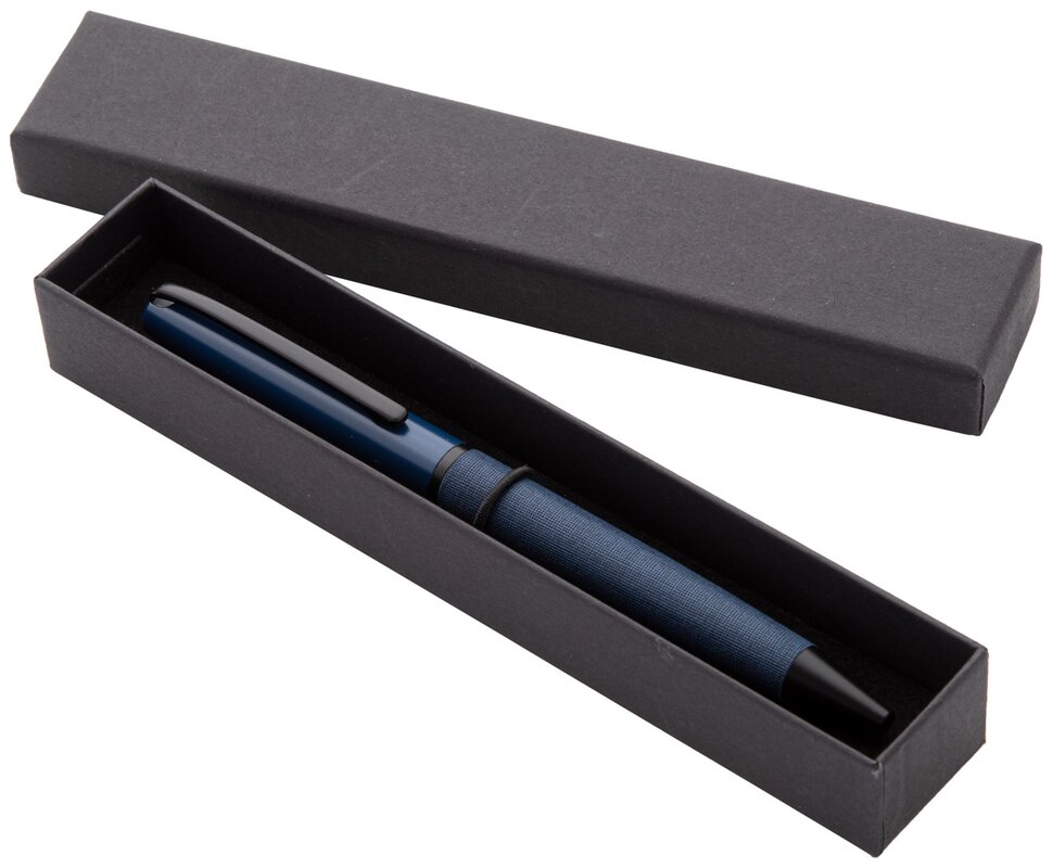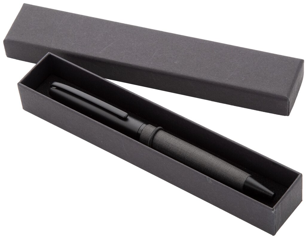 Elegantní kovové kuličkové pero s tělem potaženým PU kůží a černými částmi. V černé dárkové krabičce. S modrou náplní.