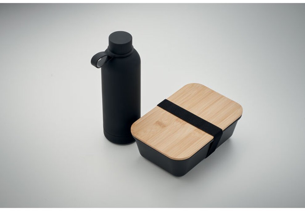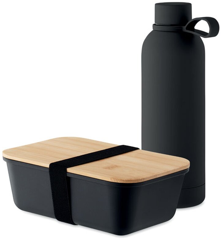 2dílná dárková obědová sada. Obsahuje láhev s dvojitou stěnou z recyklované nerezové oceli (90 % recyklovaná nerezová ocel a 10 % nerezové oceli) a krabičku na oběd (svačinový box) z recyklovaného PP s bambusovým víkem a elastickým pásem z RPET. Objem 500 ml a 900 ml.