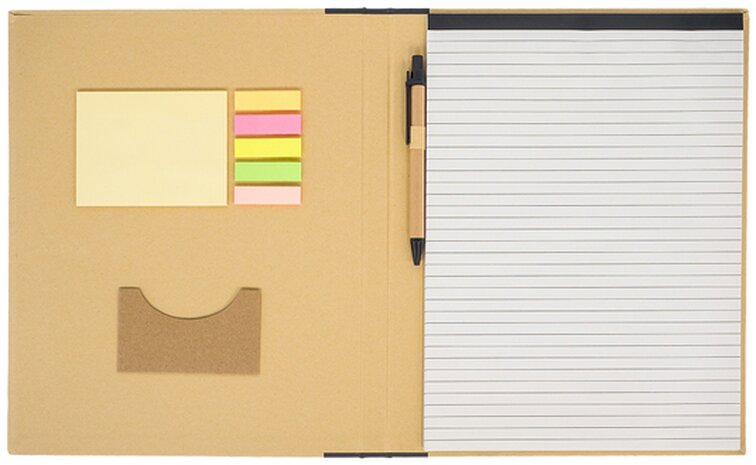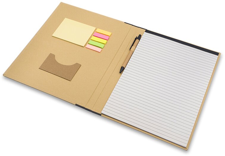 Mapa na dokumenty s tvrdými deskami. Obsahuje zápisník s 25 linkovanými listy 70 g/m2, 25 ks lepicích lístků (7,6 x 10 cm), 5 x 25 ks barevných lepicích označovačů (4,4 x 1,2 cm) a kapsu z papíru na vizitky. Součástí je kuličkové pero.