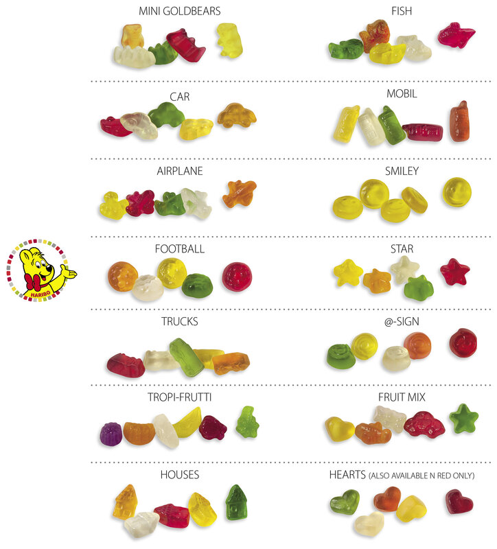 Nabízíme Originál HARIBO medvídky nabízíme v několika provedeních - sáčky plníme 6,5g / 10g / 15g v mnoha různých tvarech, které jsou v příchutích mix ananas, jablko, jahoda, pomeranč, citron, malina.
