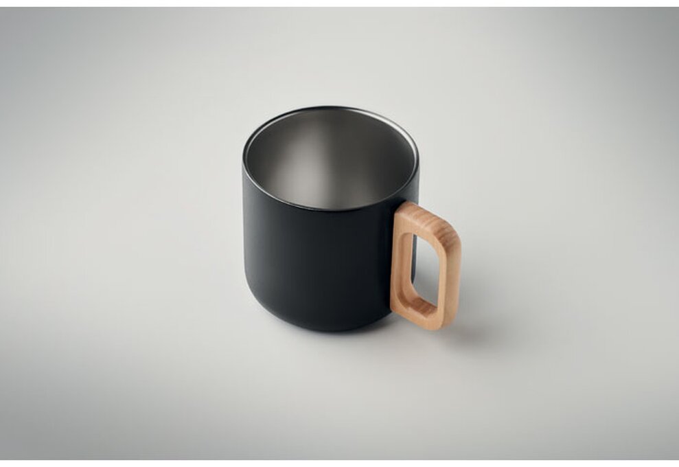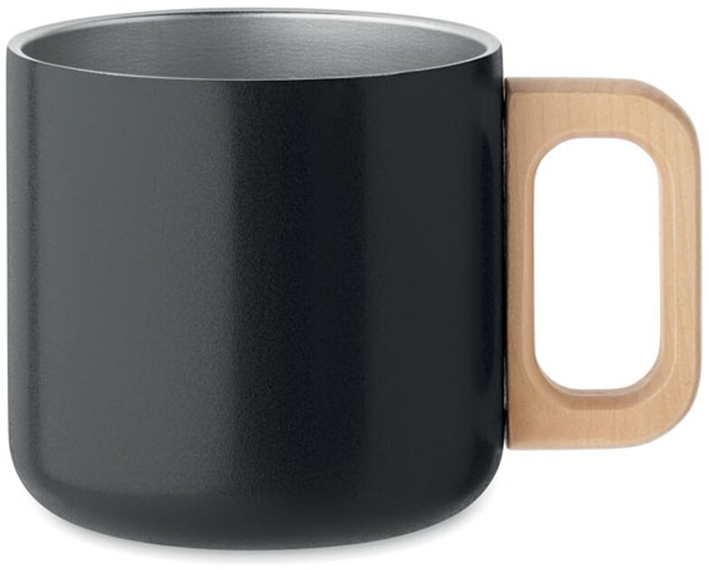 Dvoustěnný hrnek z recyklované nerezové oceli (90 % recyklované nerezové oceli a 10 % nerezové oceli) s dřevěným uchem. Objem: 350 ml.