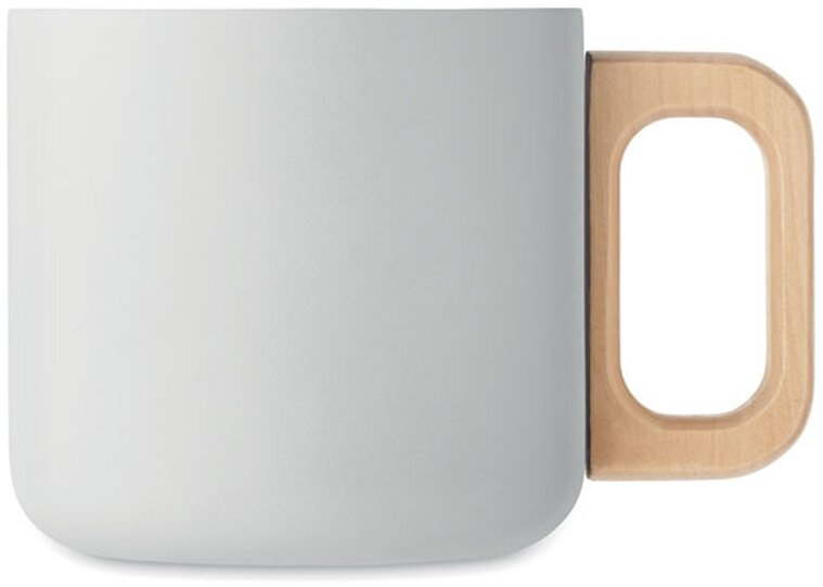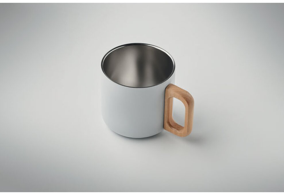 Dvoustěnný hrnek z recyklované nerezové oceli (90 % recyklované nerezové oceli a 10 % nerezové oceli) s dřevěným uchem. Objem: 350 ml.