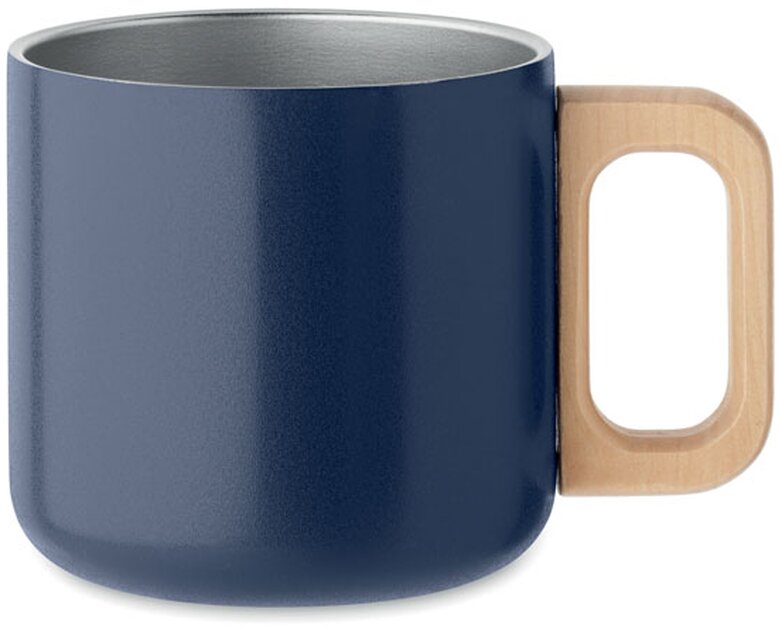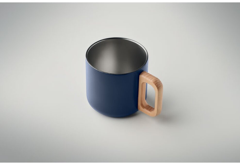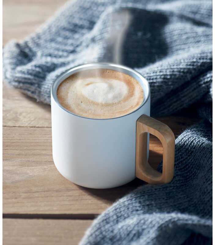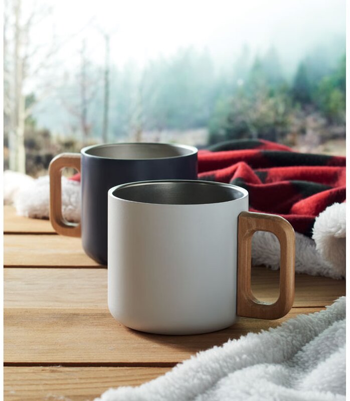 Dvoustěnný hrnek z recyklované nerezové oceli (90 % recyklované nerezové oceli a 10 % nerezové oceli) s dřevěným uchem. Objem: 350 ml.