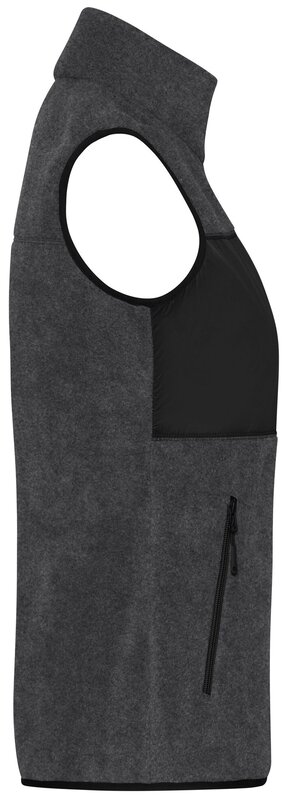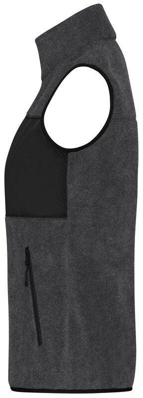 Fleecová vesta s mixem materiálů - polyester fleece, hladký polyester - pro možnost tisku loga. Klasický měkký a snadno udržovatelný fleece z recyklovaného polyesteru. Vsadka s tkané látky s náprsní kapsou. 2 boční kapsy, 1 náprsní kapsa na zip. Uvnitř dvě kapsy. Dvoucestný zip. Kvalitní značkové zipy - YKK
