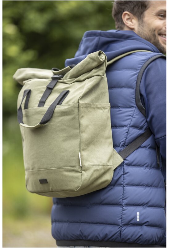 Batoh Joey inspirovaný maloobchodem je vyroben z vysoce odolných a udržitelných materiálů, recyklovaného plátna GRS a podšívky GRS RPET. Může se pochlubit speciálním pouzdrem na tablet spolu s polstrovanou přihrádkou na 15" notebook. Batoh má také 2 boční kapsy na vodu a jednu velkou přední kapsu na zip a také rolovací otvor na zip pro maximální skladování a bezpečnost. Díky 2 vyztuženým popruhovým držadlům se snadno a pohodlně přenáší jako firemní taška. Díky dekorativní kovové desce vynikne logo s jemným a matným povrchem.