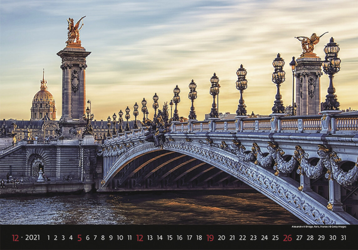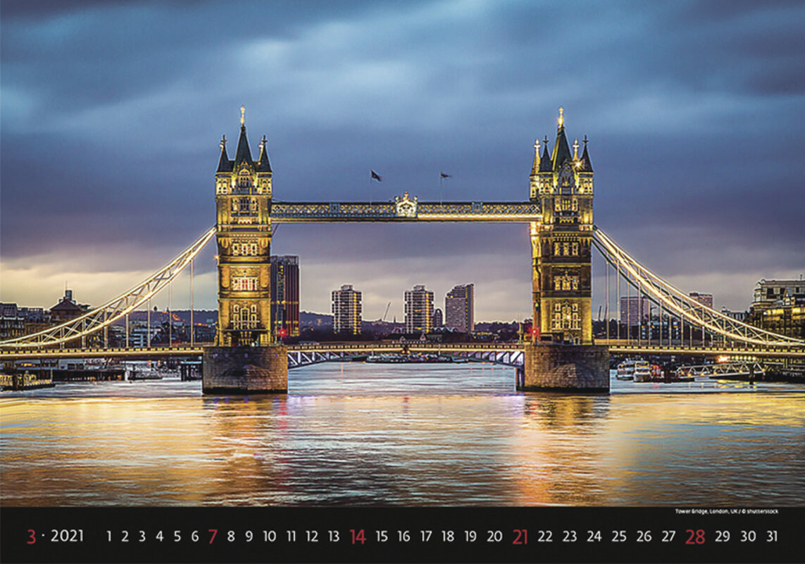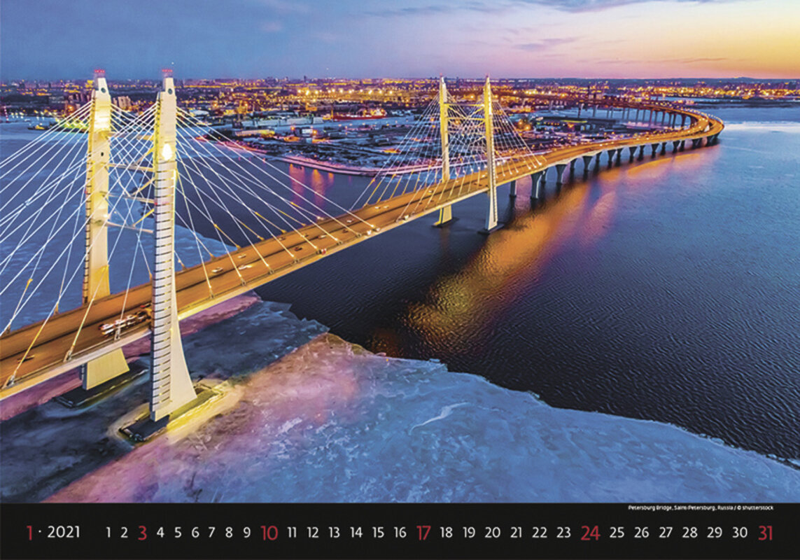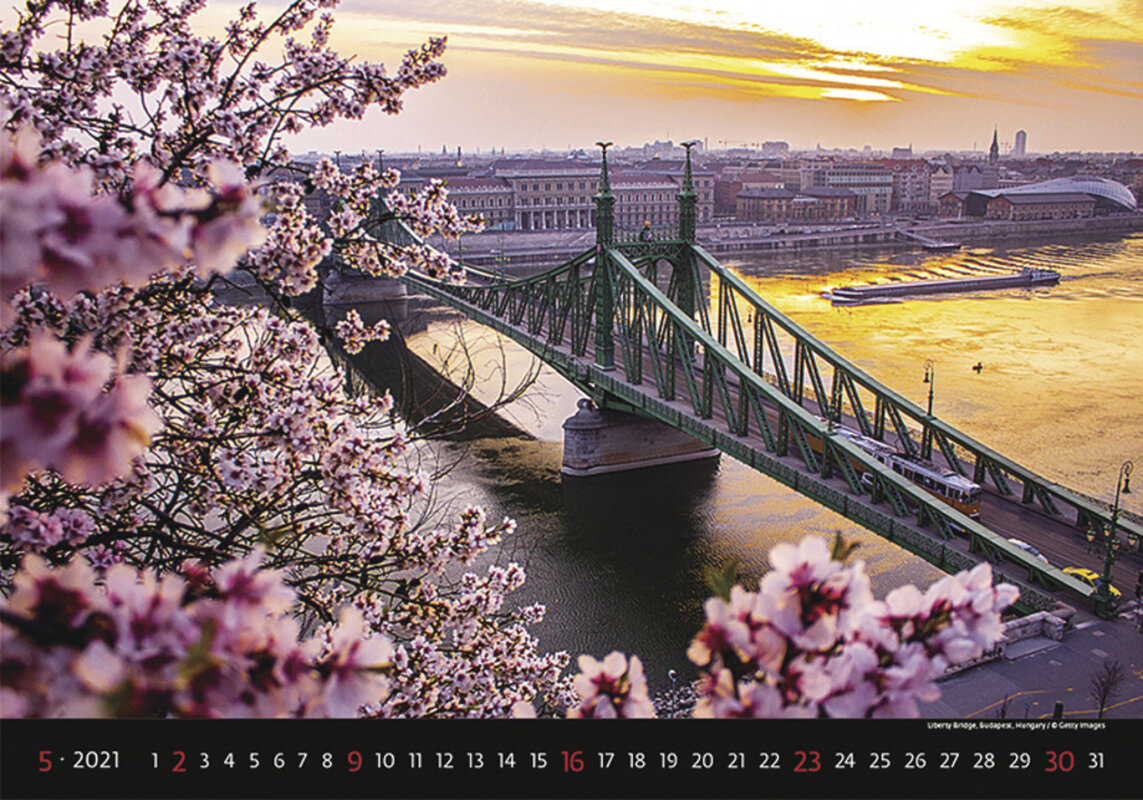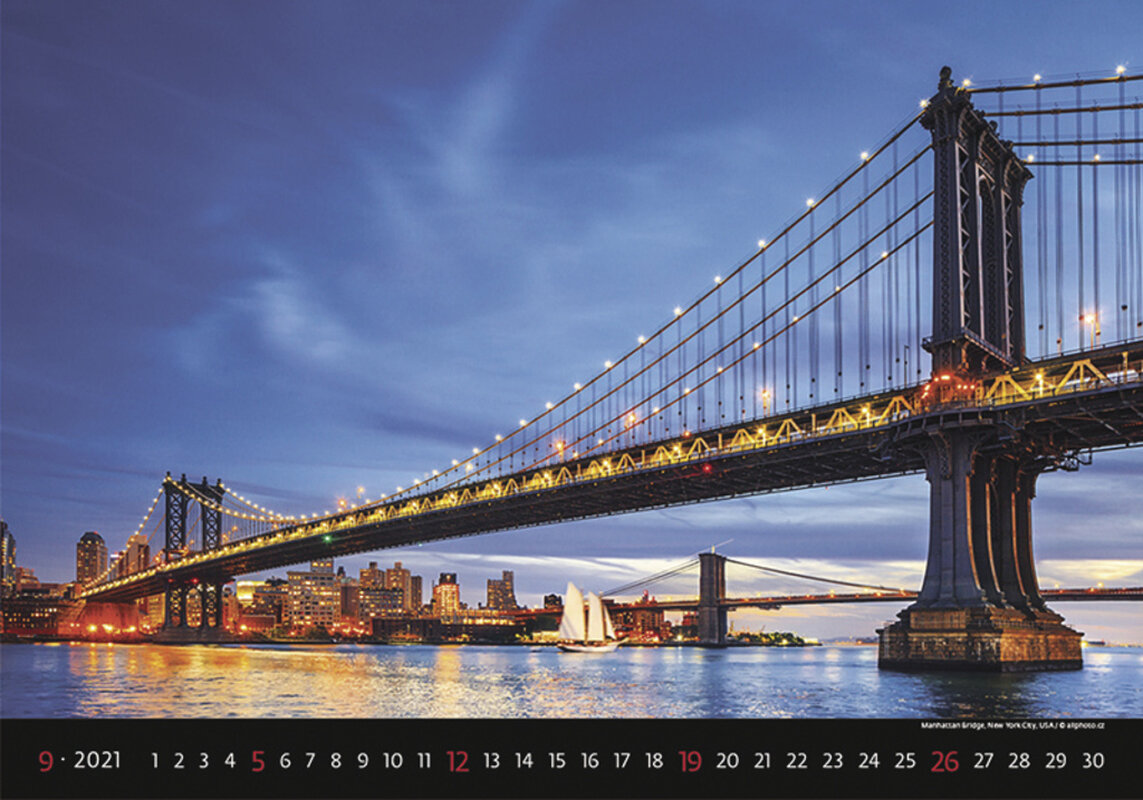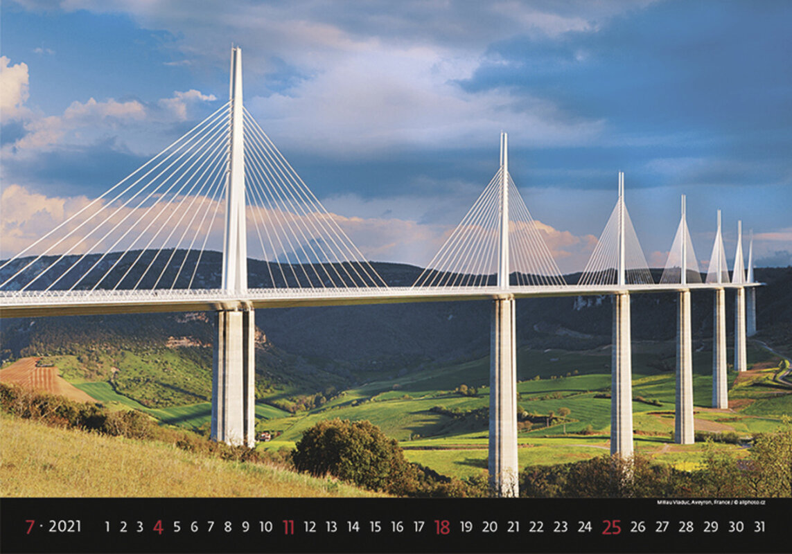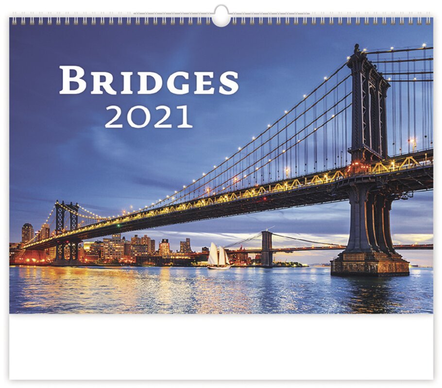 Nástěnný kalendář s fotografiemi moderních i historických mostů.