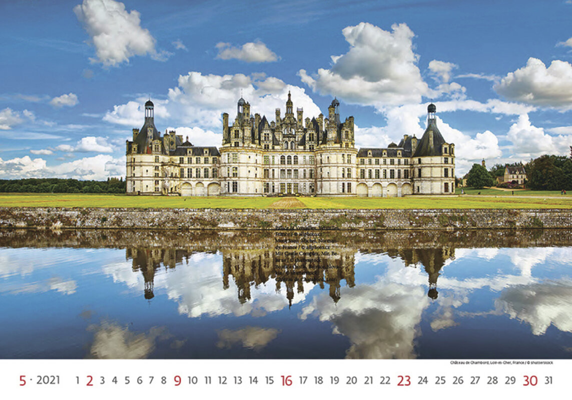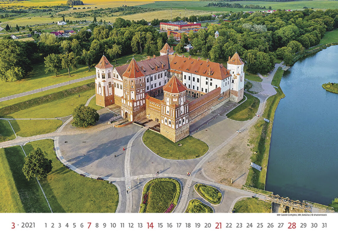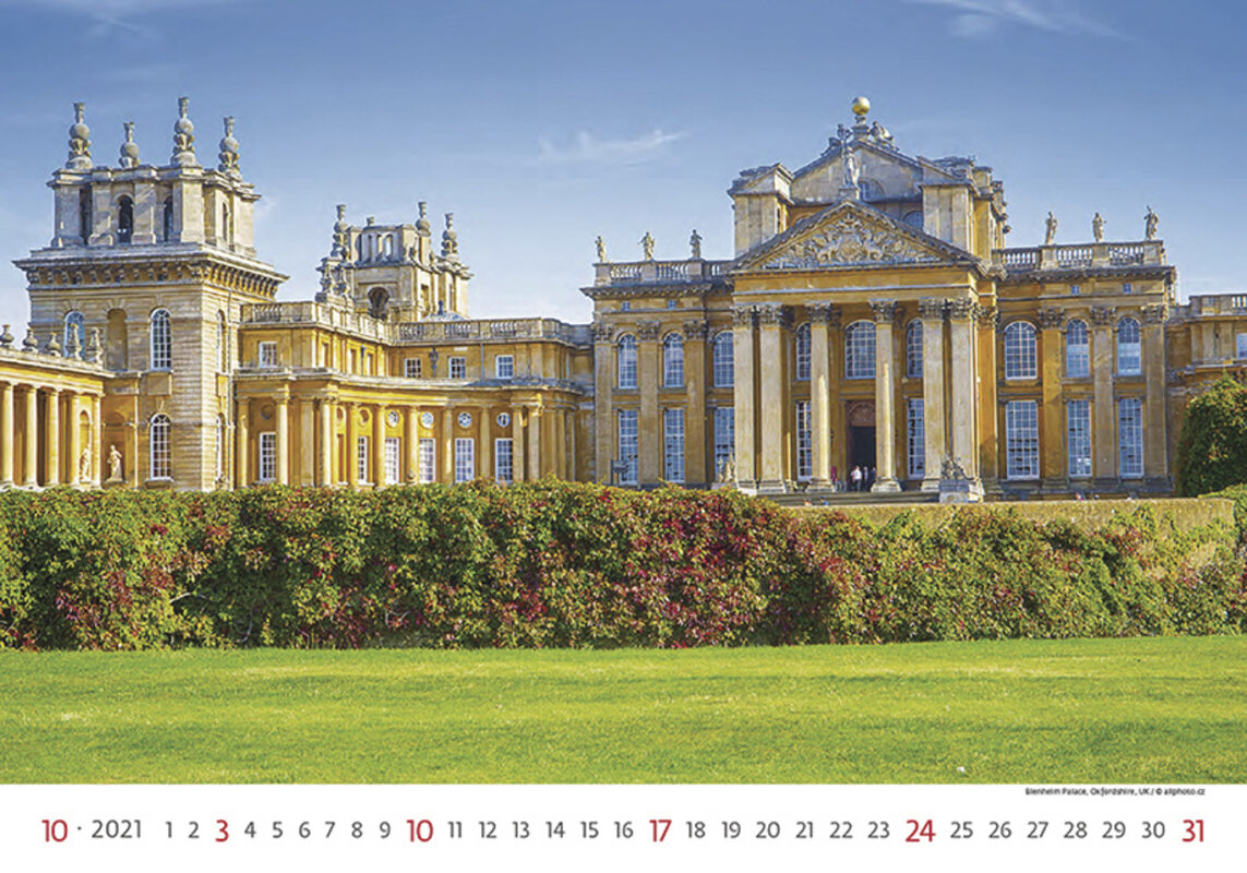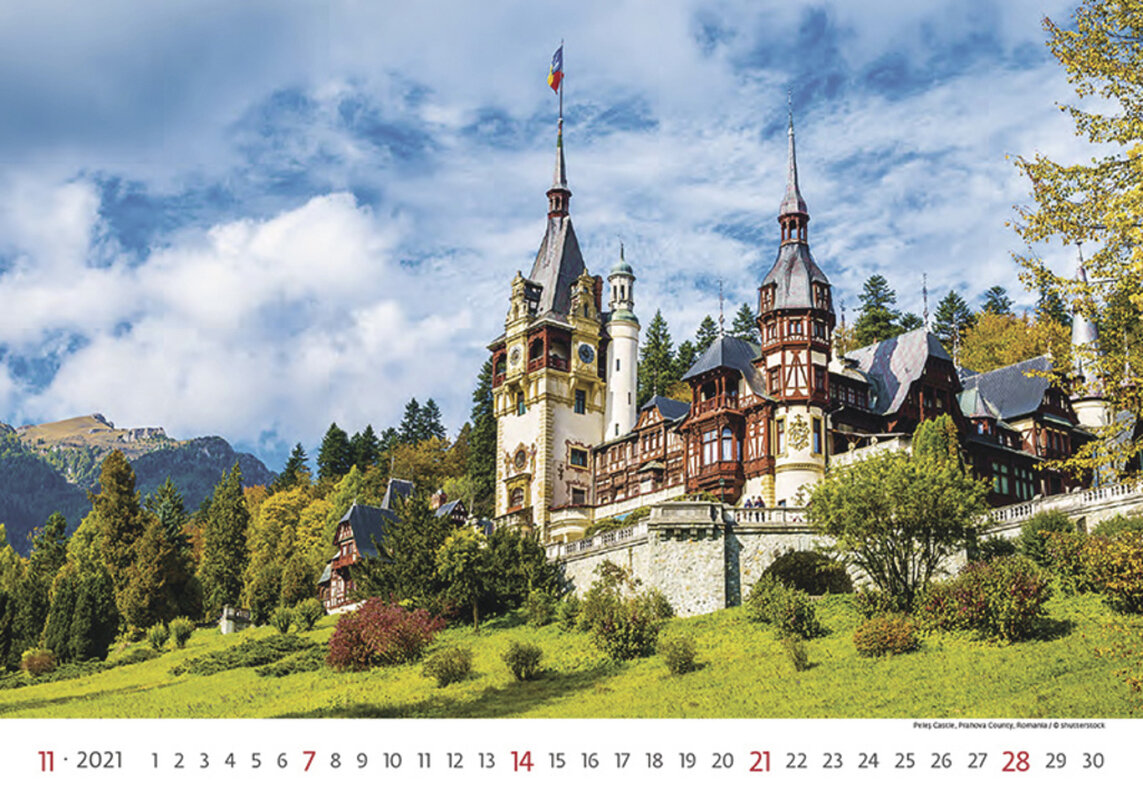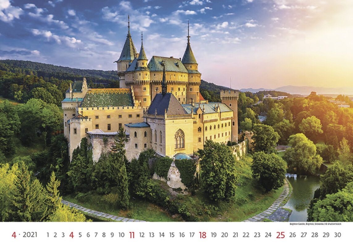 Nástěnný kalendář s fotografiemi majestátních hradů a zámků.