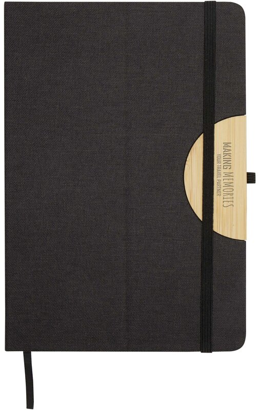 - Zápisník A5 z materiálu RPET s tvrdou vazbou, černou elastickou gumičkou a stuhou jako záložkou. Obsahuje 80 linkovaných listů krémového papíru (80 g/m²).