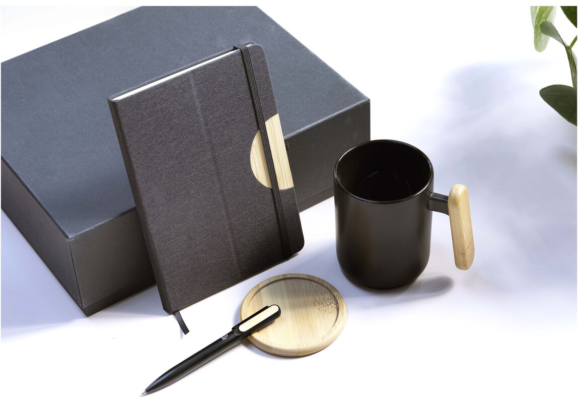 Elegantní dárková sada Laura spojuje praktické kancelářské doplňky s moderním designem. Obsahuje zápisník A5 z RPET, kuličkové pero, keramický hrnek s podtáckem – vše uloženo v dárkové krabičce. Ideální jako reprezentativní dárek pro zaměstnance, obchodní partnery či klienty.