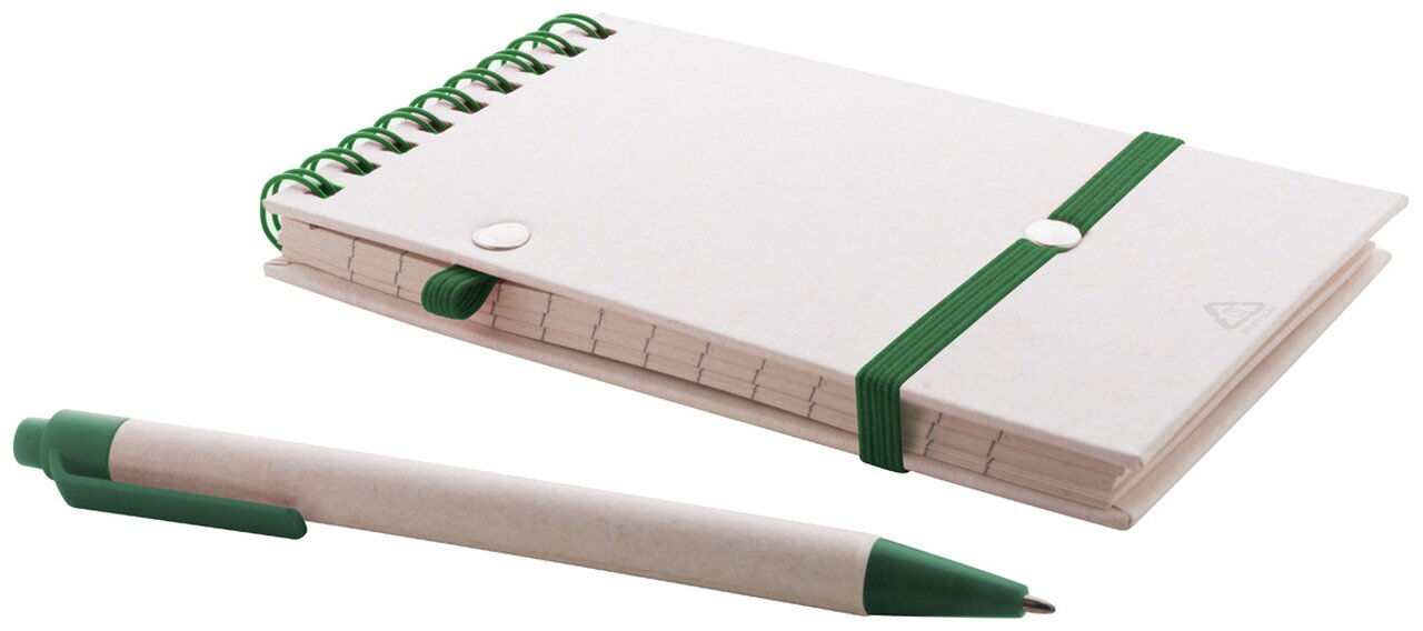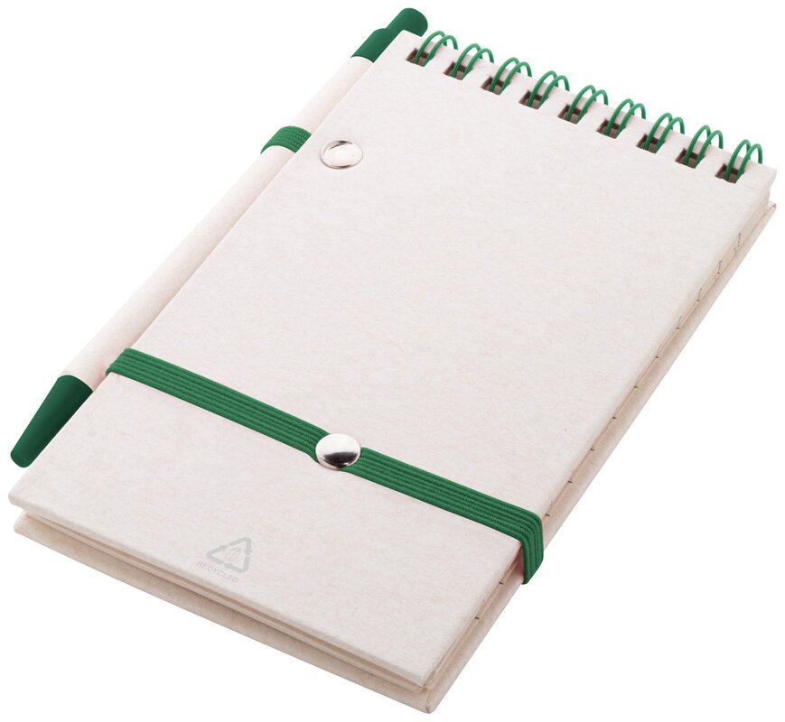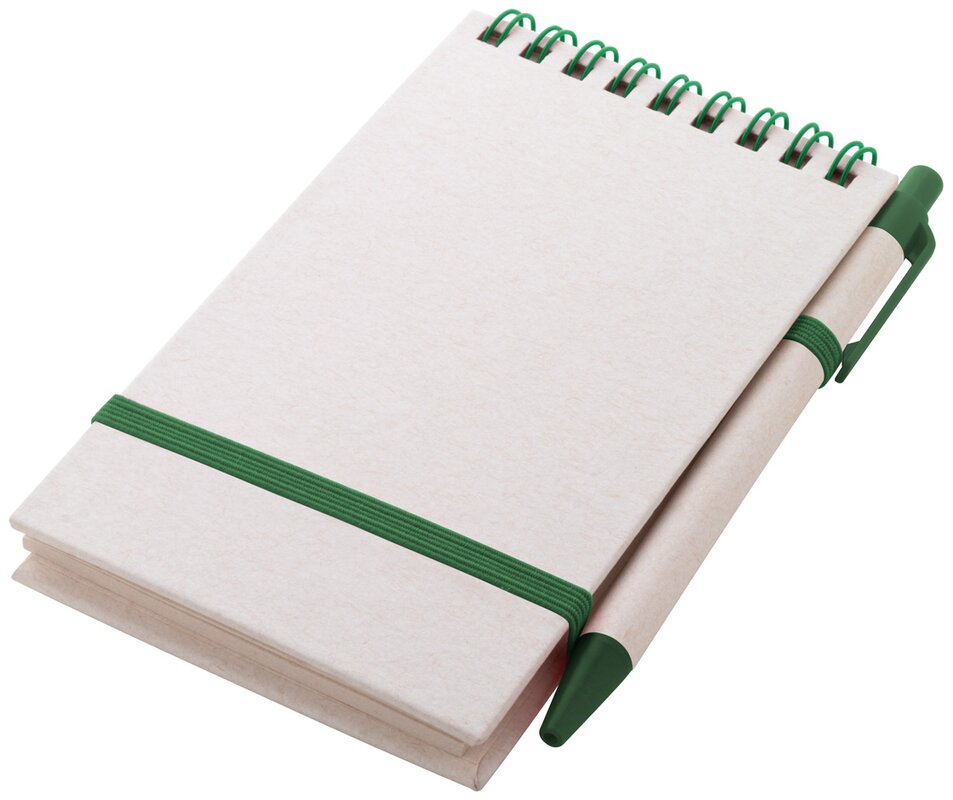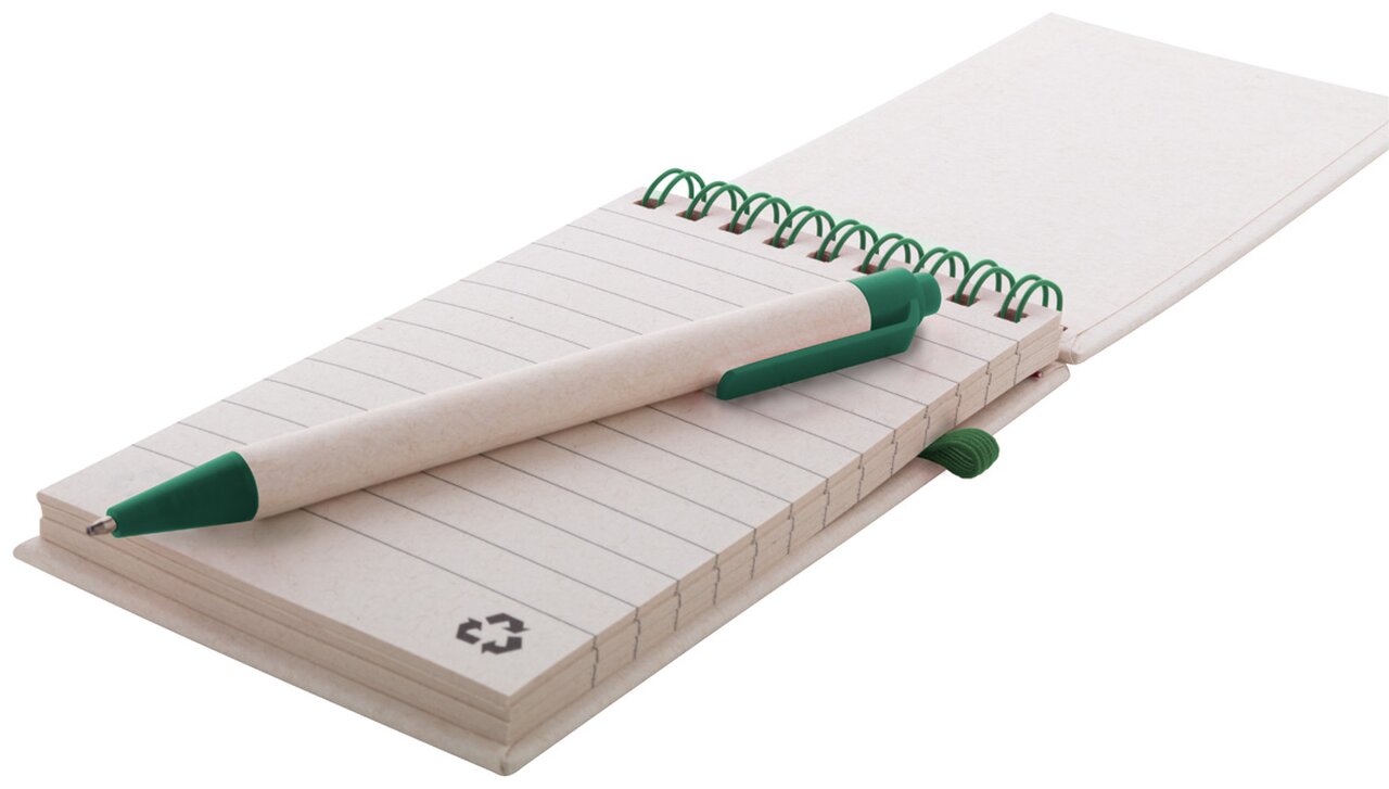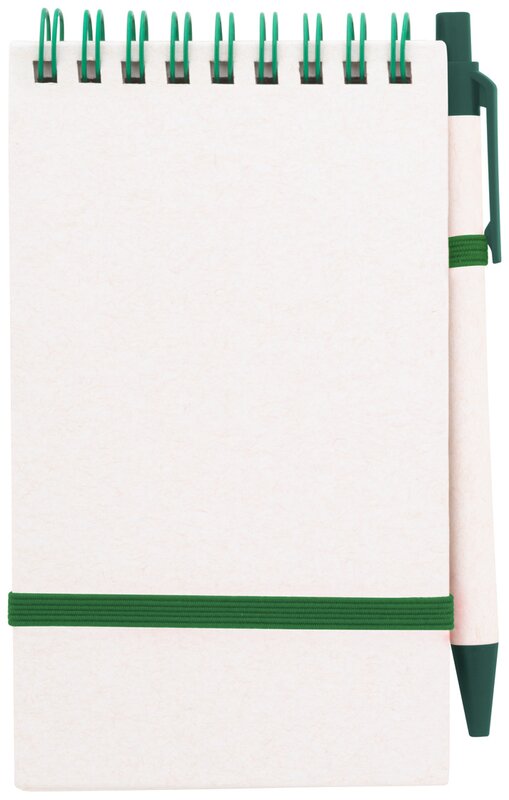 Blok má pevnou spirálovou vazbu v barvě desek, 70 linkovaných listů z recyklovaného papíru a praktickou gumičku pro bezpečné uzavření. Nechybí ani poutko na pero, do kterého perfektně pasuje přiložená ekologická propiska z recyklovaného ABS plastu.