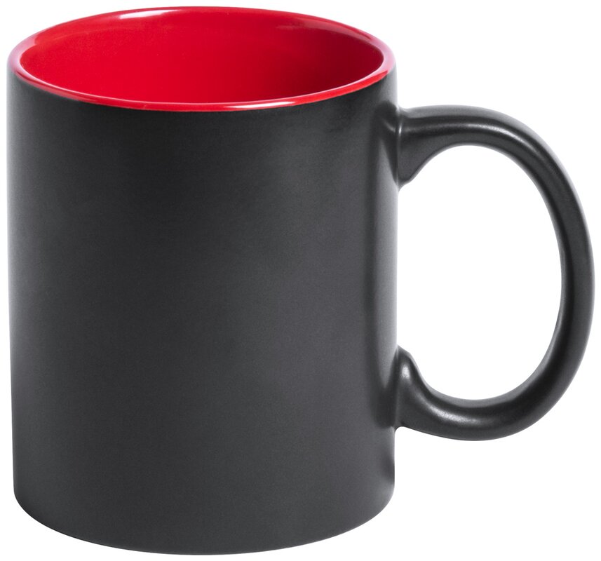 Keramický hrnek klasického tvaru v kombinaci vnější černé barvy a barevného vnitřku.