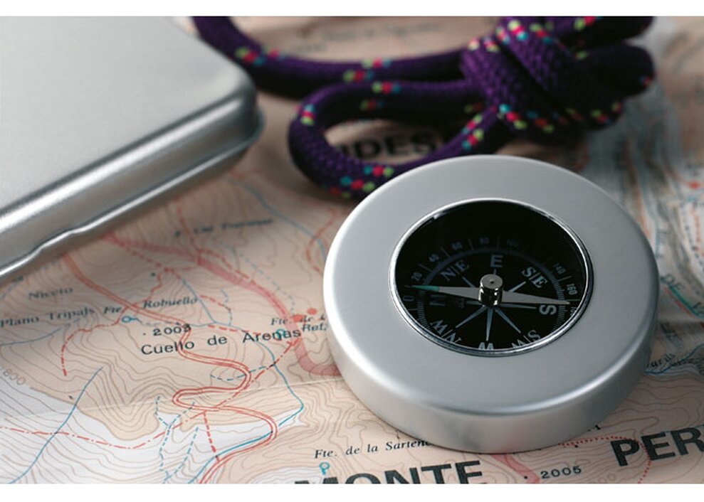 Klasický hliníkový námořní kompas v kovovém pouzdře.
