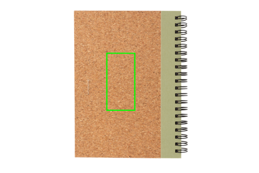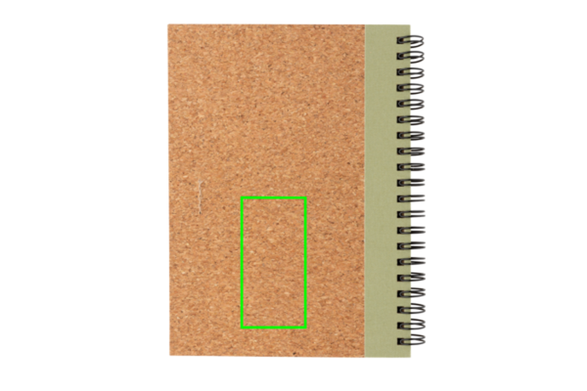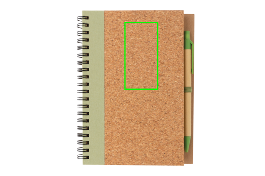 Poznámkový blok s kroužkovou vazbou, korkovým obalem a kraftovým perem. Obsahuje 70 stran/140 listů linkovaného krémového recyklovaného papíru o gramáži 70g/m2.