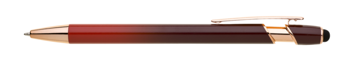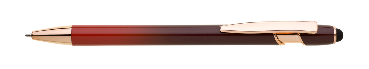 Kovová propiska, která zaujme na první pohled výrazným barevným přechodem v teplých tónech a elegantními detaily v odstínu růžového zlata. Praktickým bonusem je dotykový hrot, díky kterému snadno ovládnete telefon nebo tablet bez nutnosti sundávat rukavice či hledat displejovou tužku. Uvnitř se nachází modře píšící náplň X-20, která zajišťuje plynulé a příjemné psaní. Ideální volba pro reprezentativní kancelář, firemní dárky i každodenní použití.