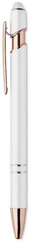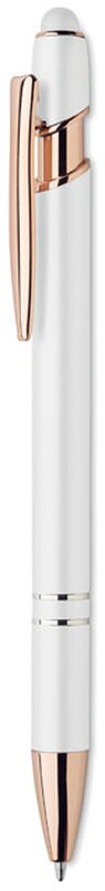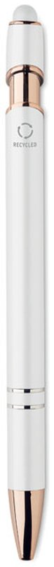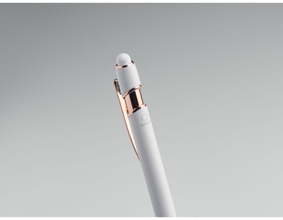 Recyklované hliníkové stylusové kuličkové pero s růžově zlatými detaily. Modrý inkoust.