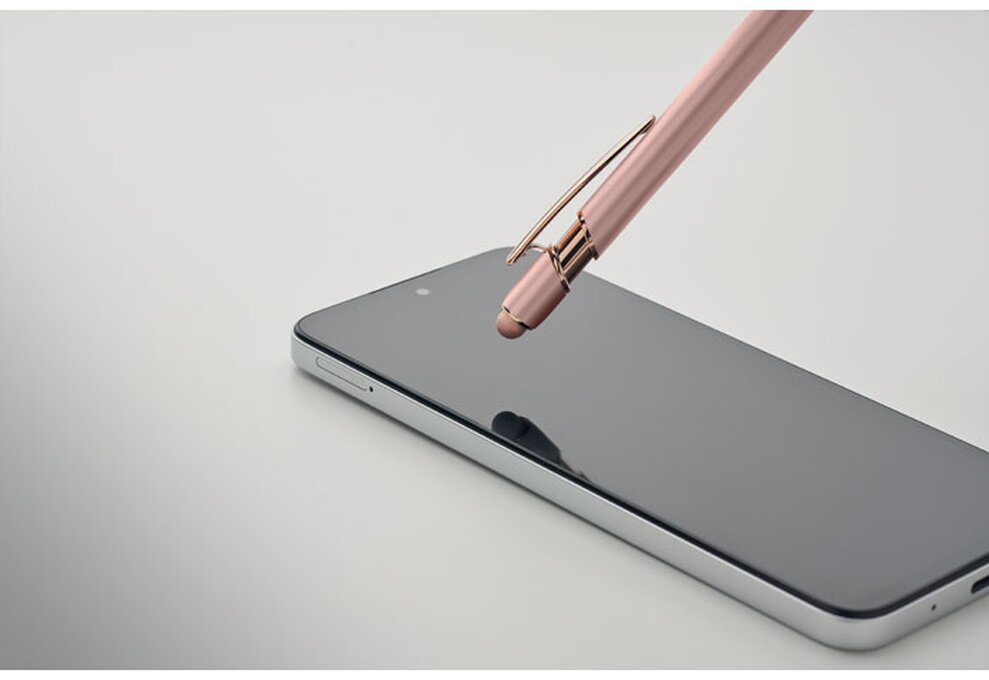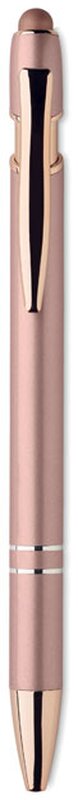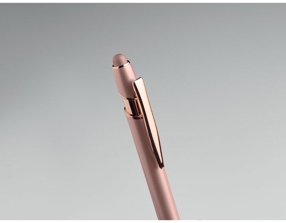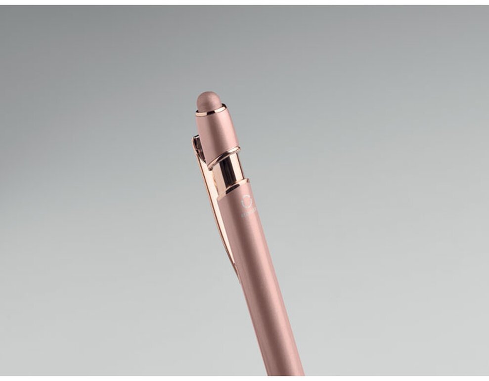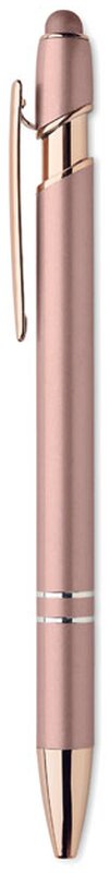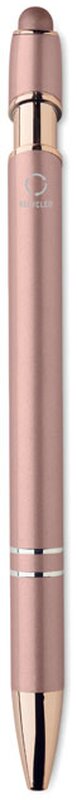 Recyklované hliníkové stylusové kuličkové pero s růžově zlatými detaily. Modrý inkoust.