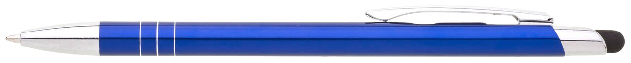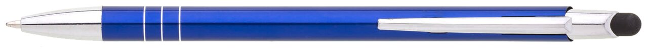 Tenká a lehká kovová propiska se stylusem a chromovými kontrastními proužky. Modře píšící náplň.