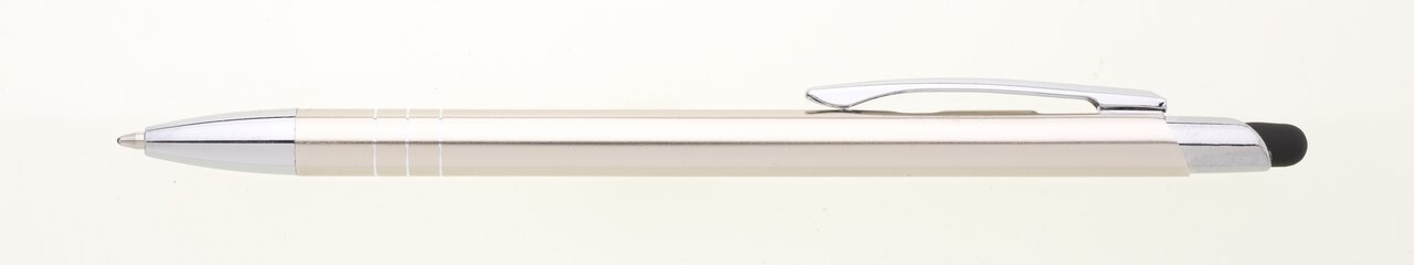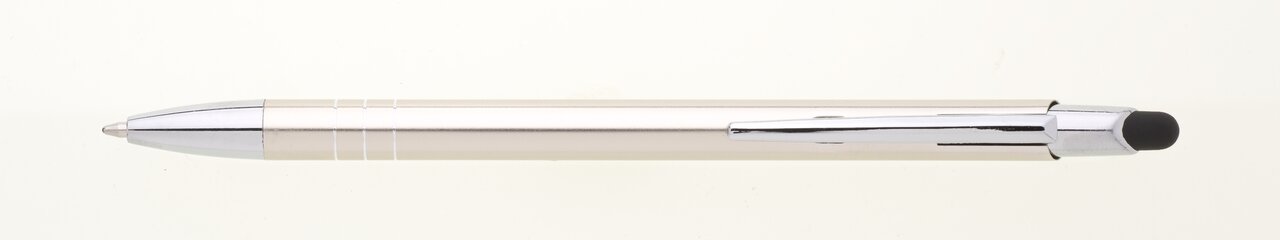 Tenká a lehká kovová propiska se stylusem a chromovými kontrastními proužky. Modře píšící náplň.