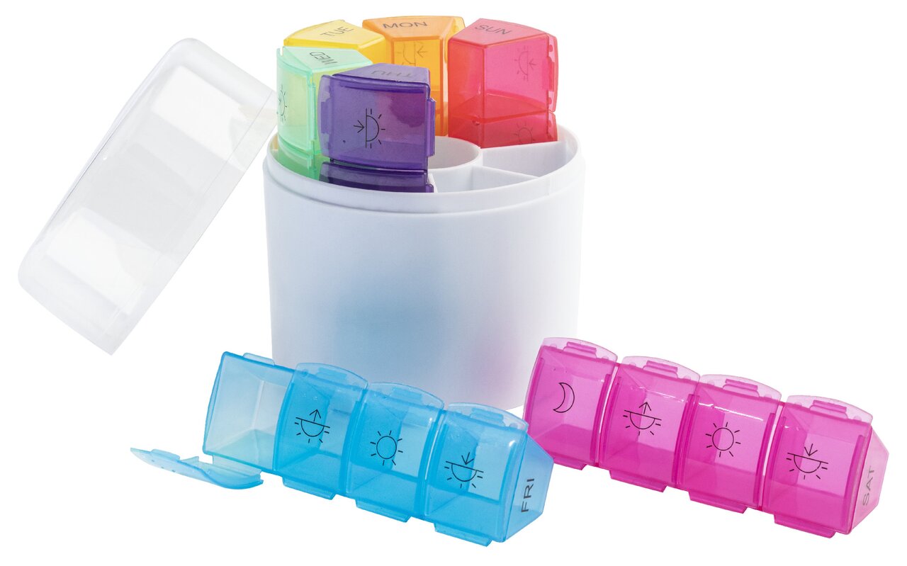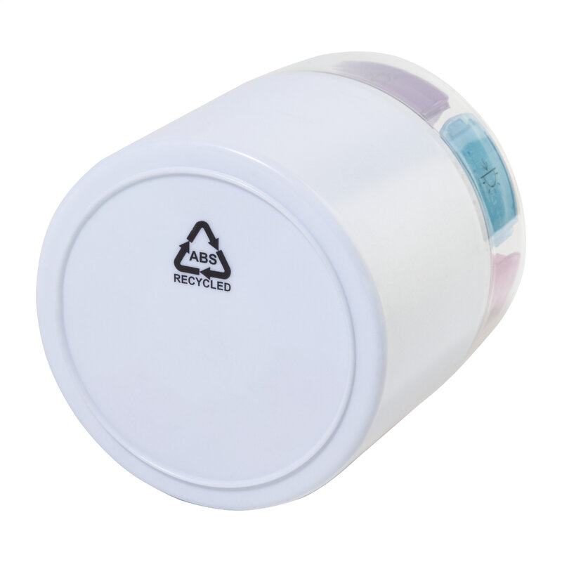 Sada týdenních krabiček na léky z recyklovaného ABS plastu se 7 denními krabičkami, každá má 4 přihrádky pro různé denní doby. Dodáváno v kulatém stojanu s průhledným víkem.