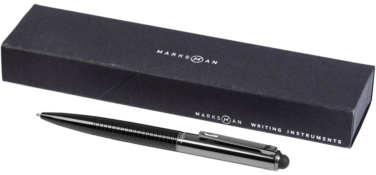 Kuličkové pero a stylus Dash. Exkluzivní designové kuličkové pero se stylovým spodním panelem. Zahrnuje vysoce kvalitní černou inkoustovou náplň a je baleno v dárkové kazetě značky Marksman. Kov.