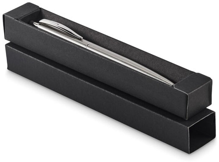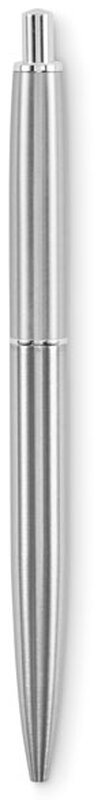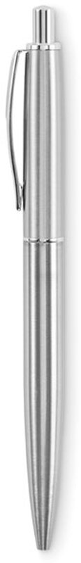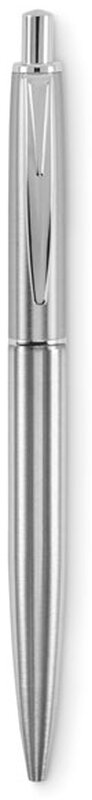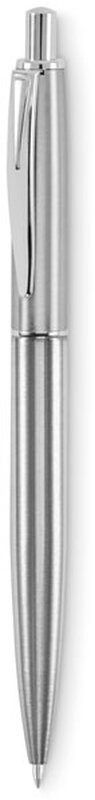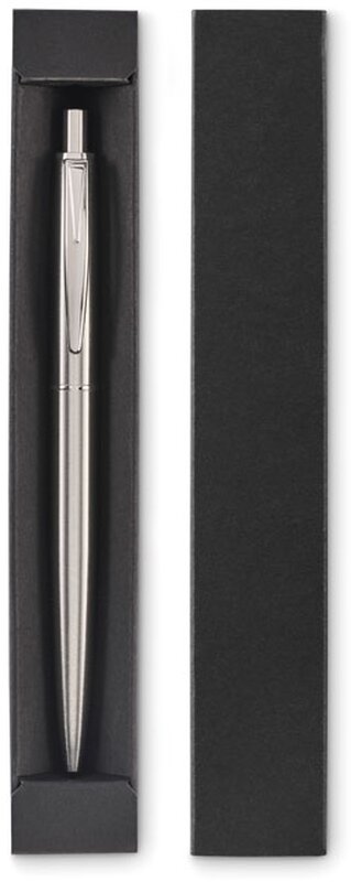 Tlačítkové kuličkové pero v těle z recyklované nerezové oceli. Modrý inkoust. Dodáváno v dárkové krabičce.