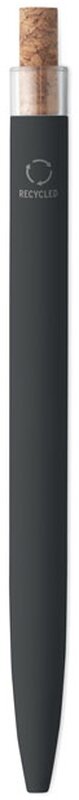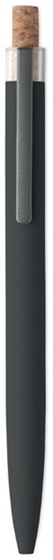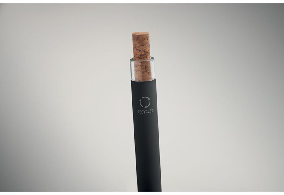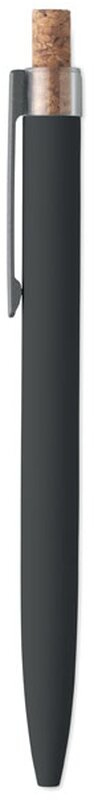 Kuličkové pero z recyklovaného hliníku s korkovým tlačítkem a kovovým klipem. Modrý inkoust.